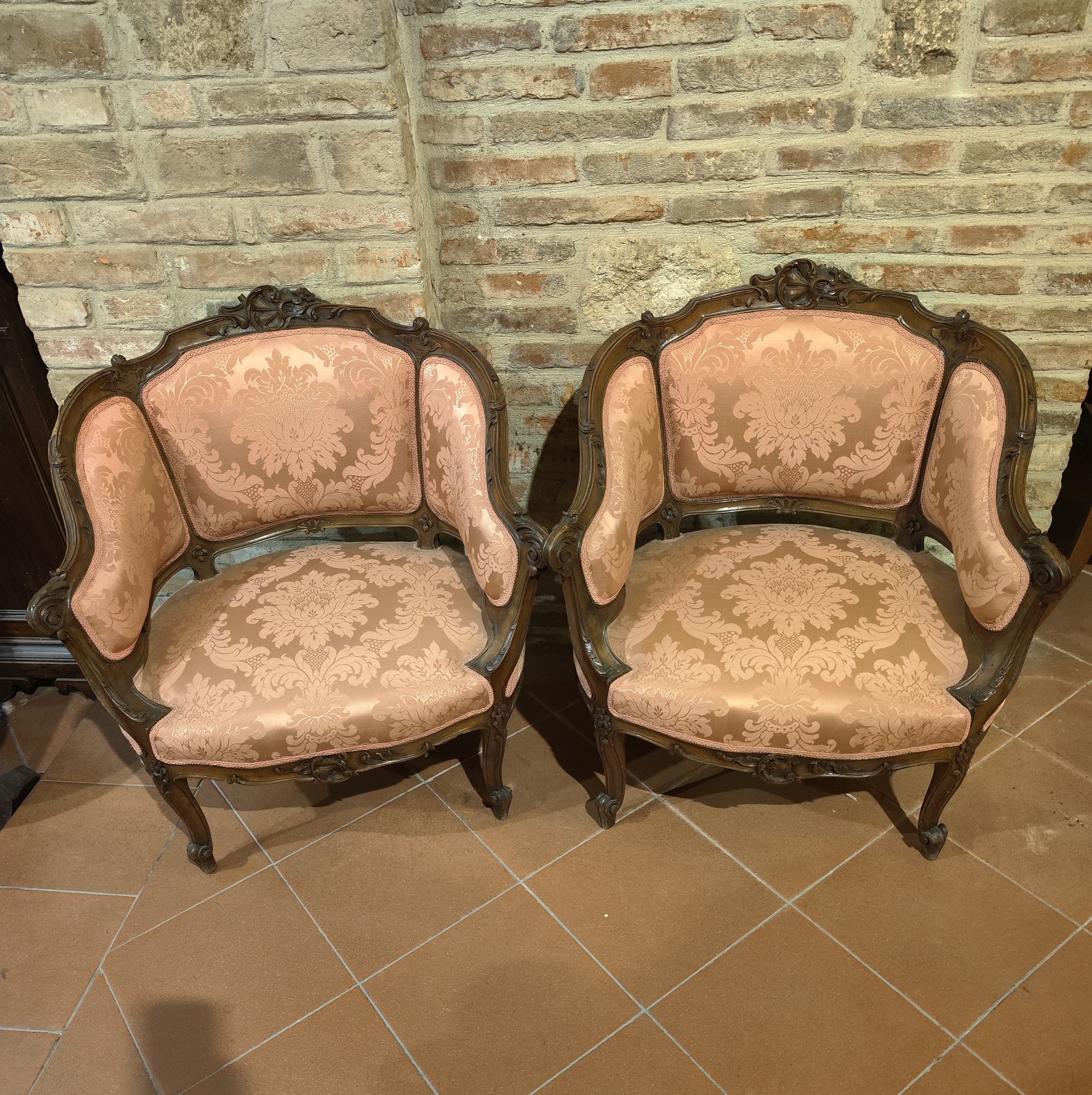 in noce sagomato ed intagliato, sedute in sete damascata, cm L70xP55xH80