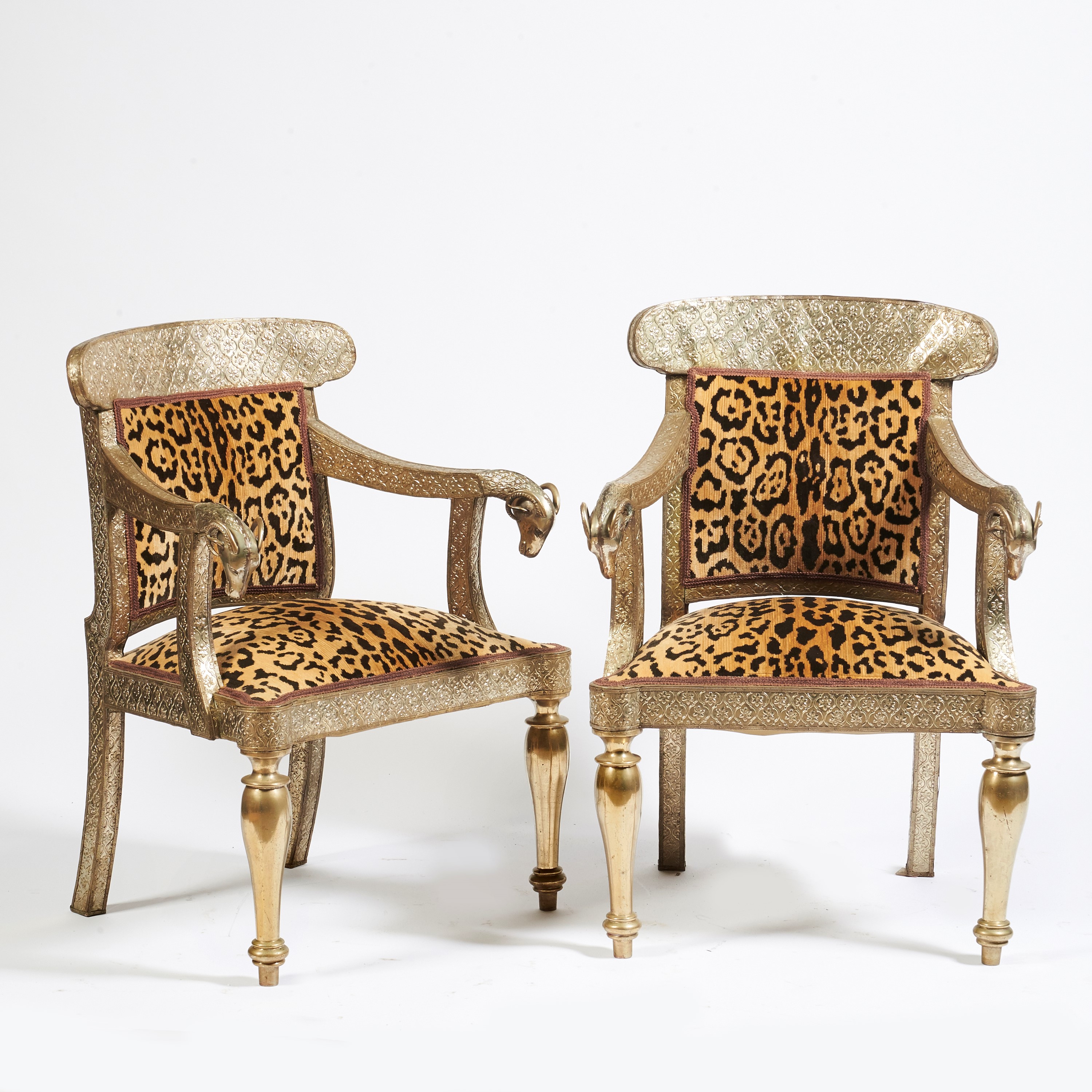 interamente rivestite in metallo argentato e cesellato, sedute e schienale rivestiti in tessuto ghepardato, alt. cm 86