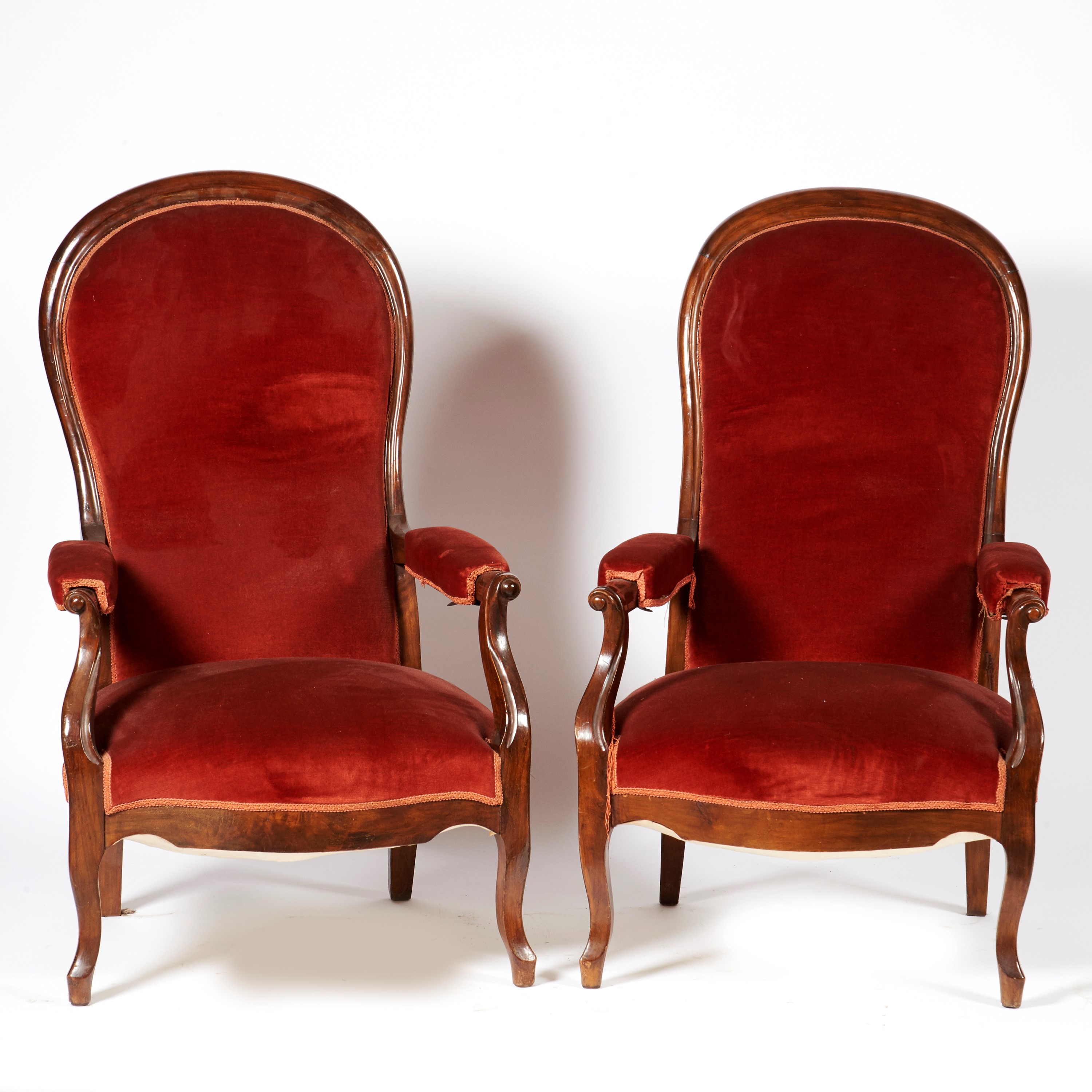 in noce con schienale reclinabile, rivestite in velluto rosso, alt. cm 114, difetti