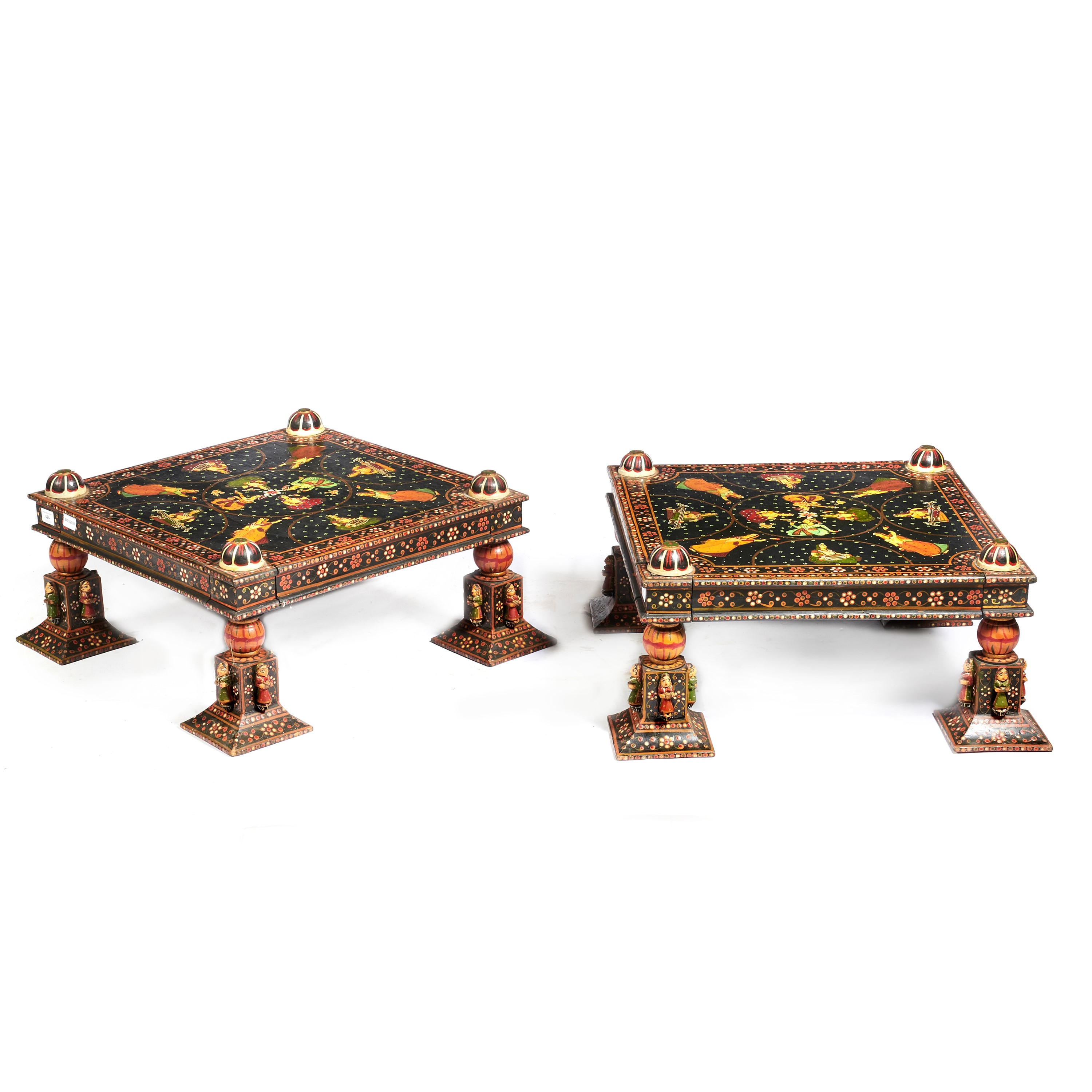 piani quadrati, interamente dipinti in policromia con pannelli circolari, semicircolari, figure di musicanti e fiori, cm L60xP60xH32, difetti