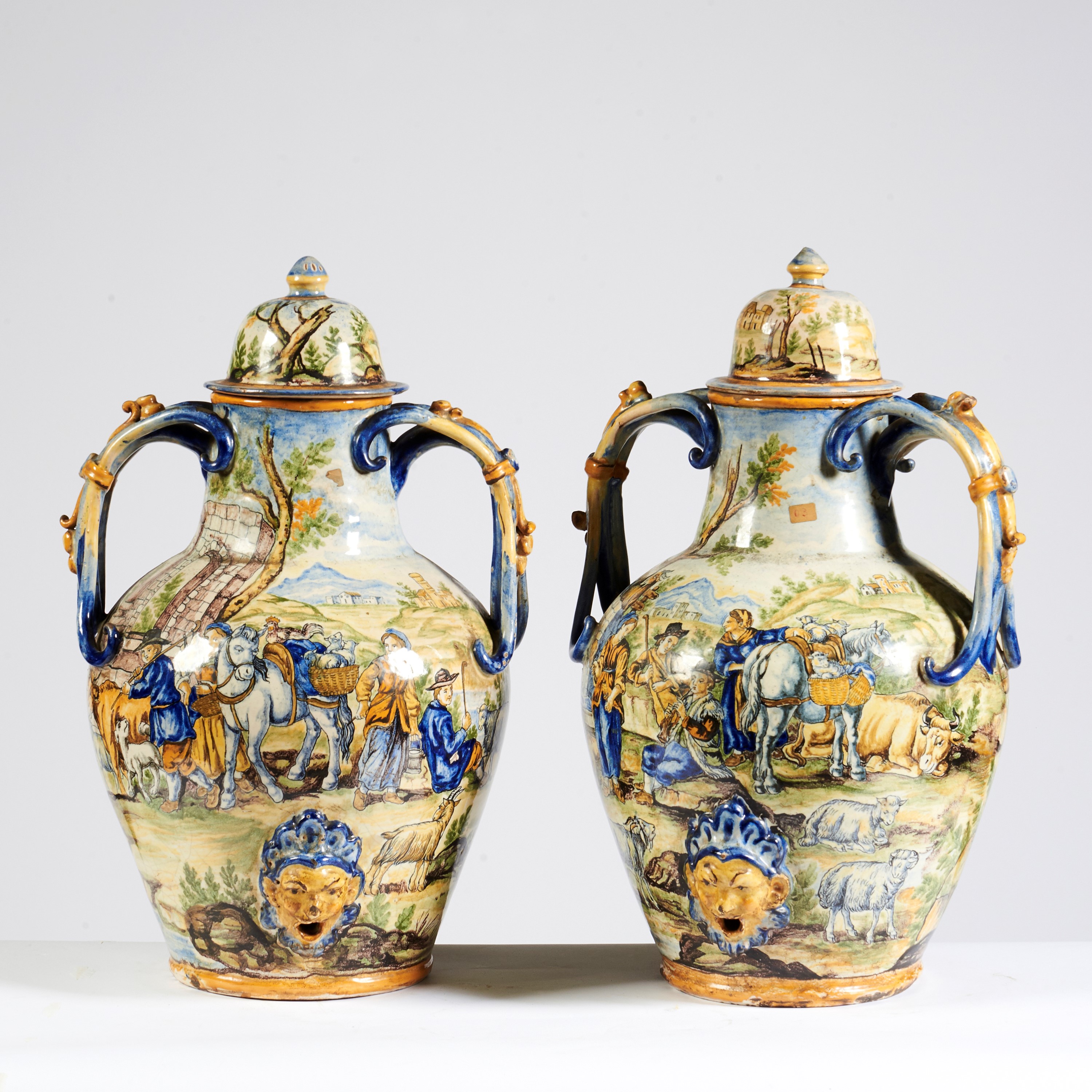 in maiolica dipinta, con paesaggi con figure, completi di tappi, alt. cm 53, difetti