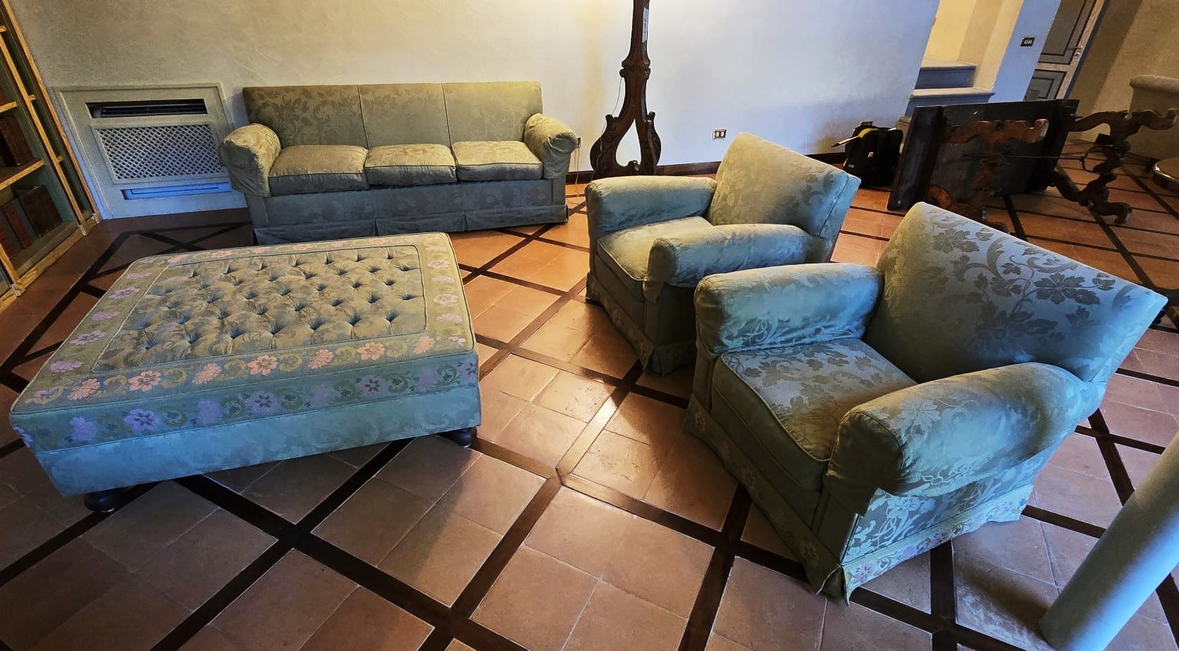 struttura in legno imbottita e rivestita in stoffa damascata nei toni del verde, divano cm L203xP77xH83 poltrone cm L92xP87xH78 e pouf cm L120xP100xH43