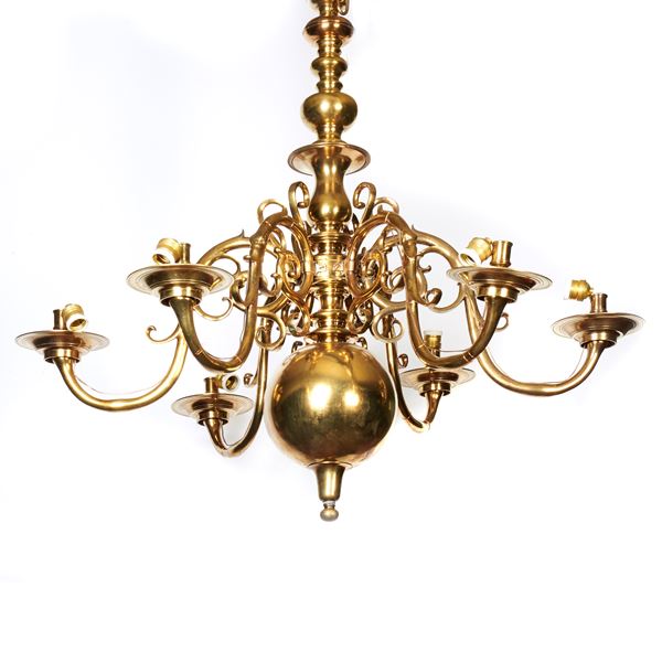in ottone, una a dodici luci, l'altra a sei luci, diam. cm 90, alt. cm 82 e diam. cm 95 e alt. cm 116