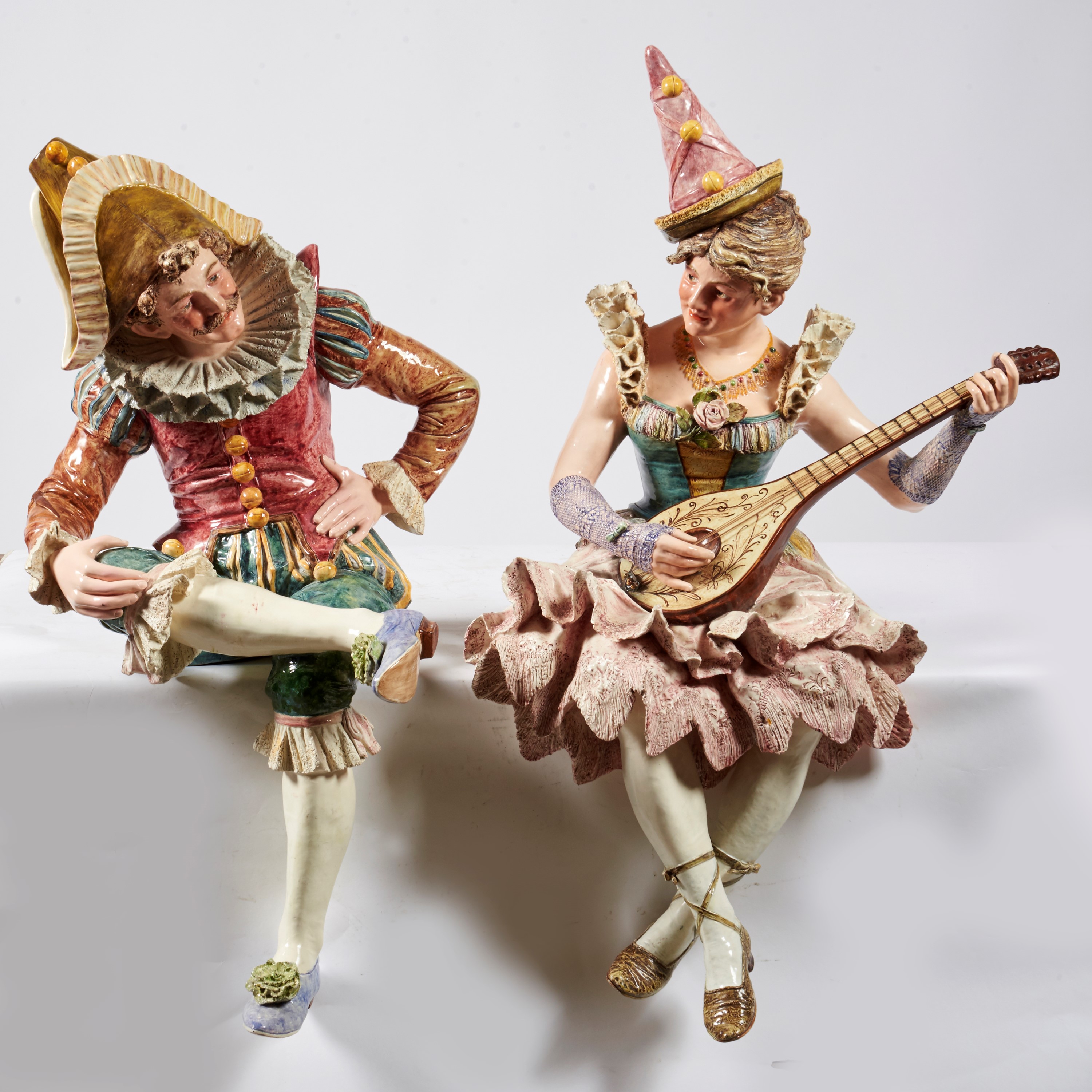 in ceramica policroma raffiguranti maschere napoletane sedute alt. cm 74 e cm 80