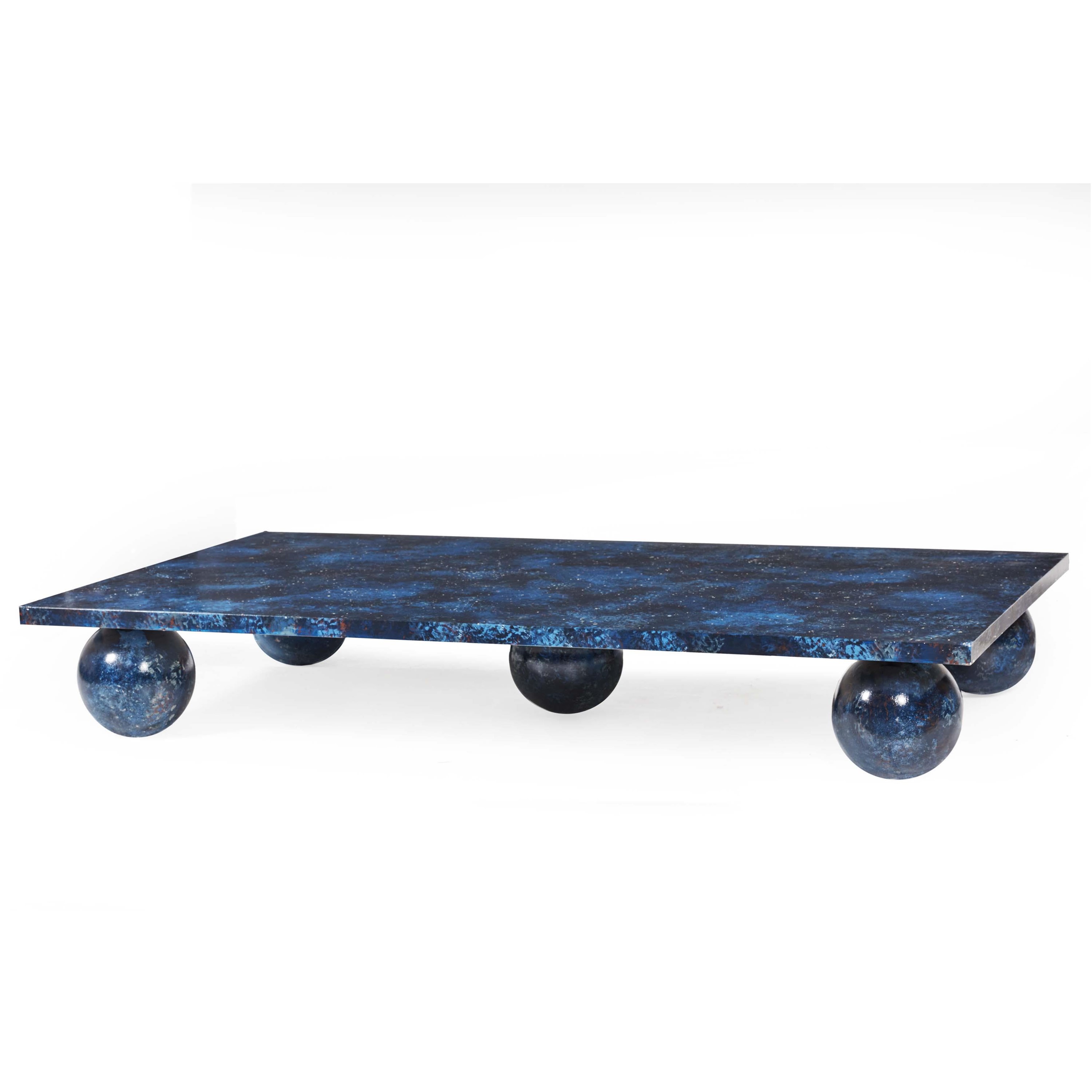 in legno dipinto ad imitare il lapislazzulo, quattro piedi a sfera, cm L205xP120xH30, difetti