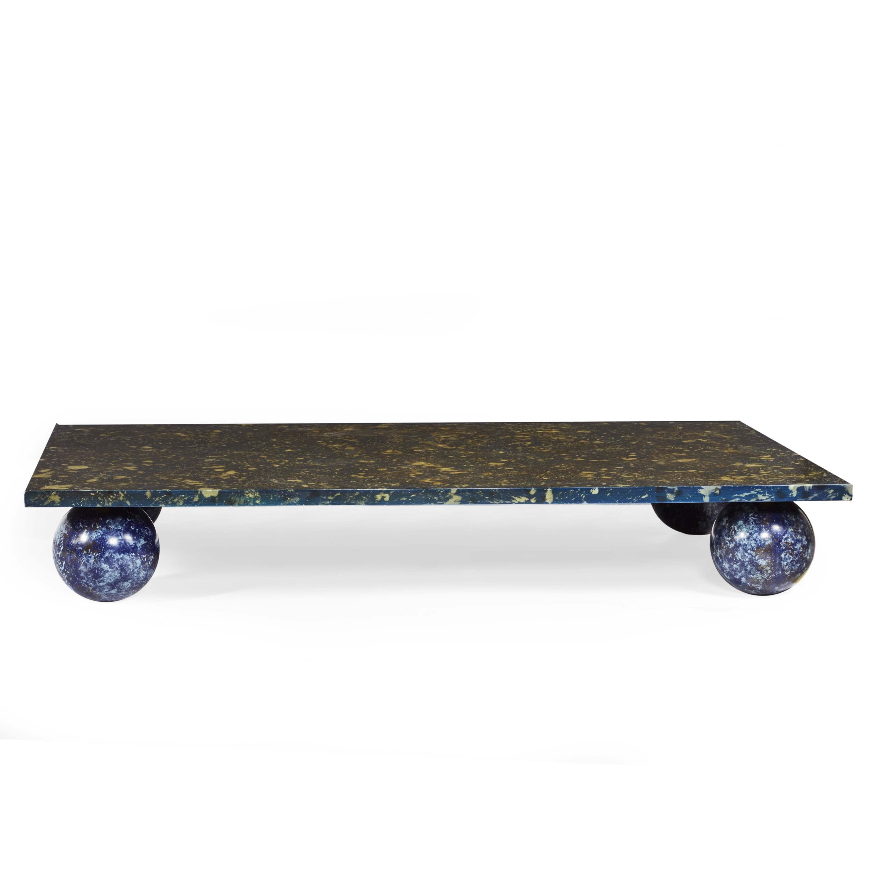 in legno dipinto ad imitare il lapislazzulo, cinque piedi a sfera, cm L205xP120xH30, difetti