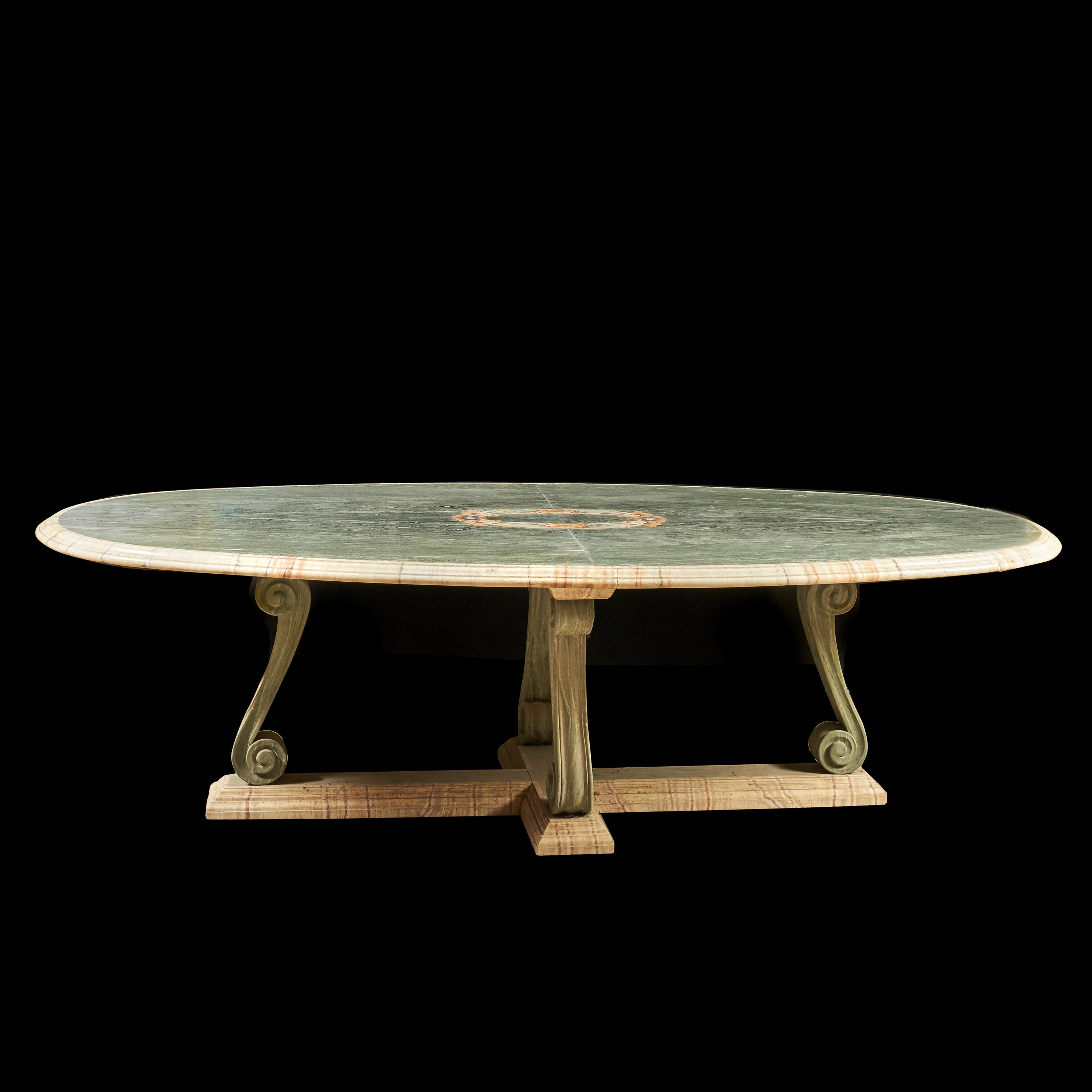 in marmo, piano ovale con intarsio centrale in pietre dure, base in legno, cm L270xP143xH81, difetti