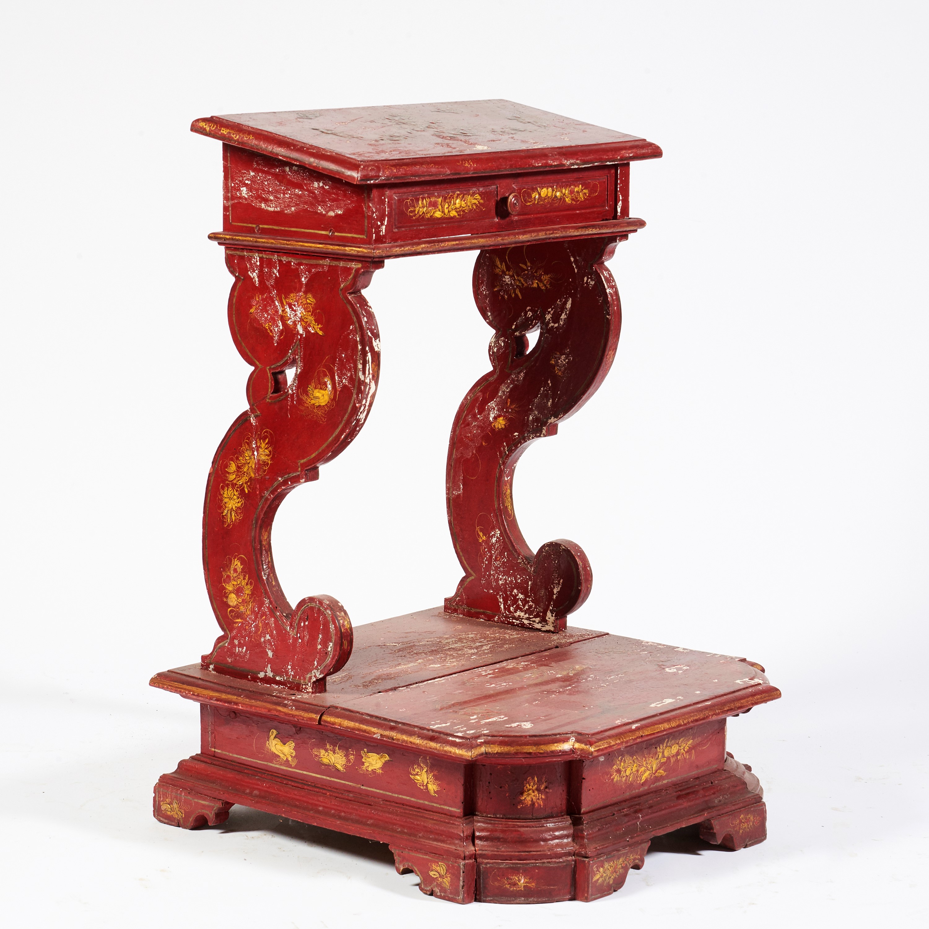 in legno laccato a cineserie, un cassetto, pedana da alzarsi, sostegni sagomati, cm L60xP65xH92, difetti