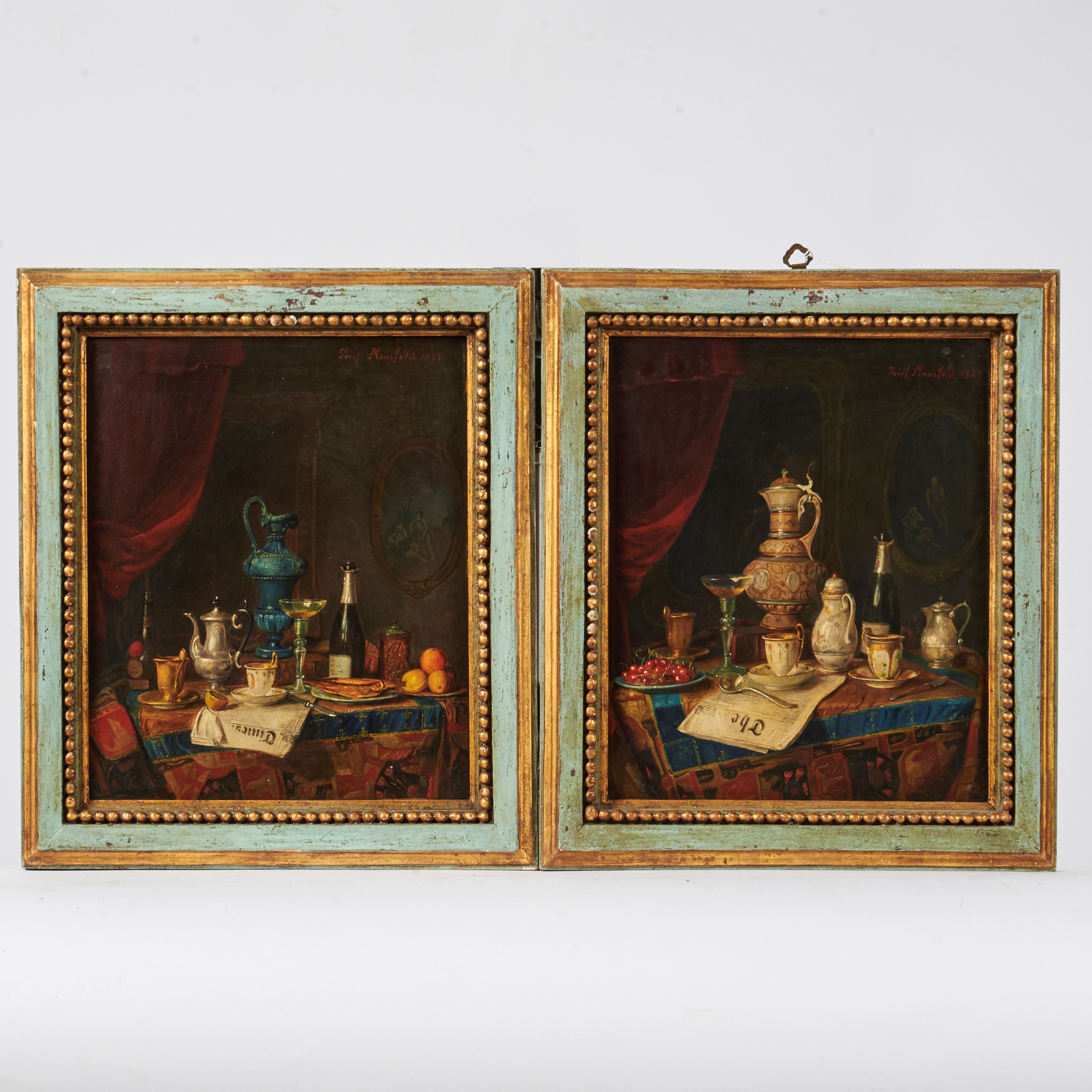 coppia di dipinti, olio su tavoletta, firmati e datati 1888, cm 31x26