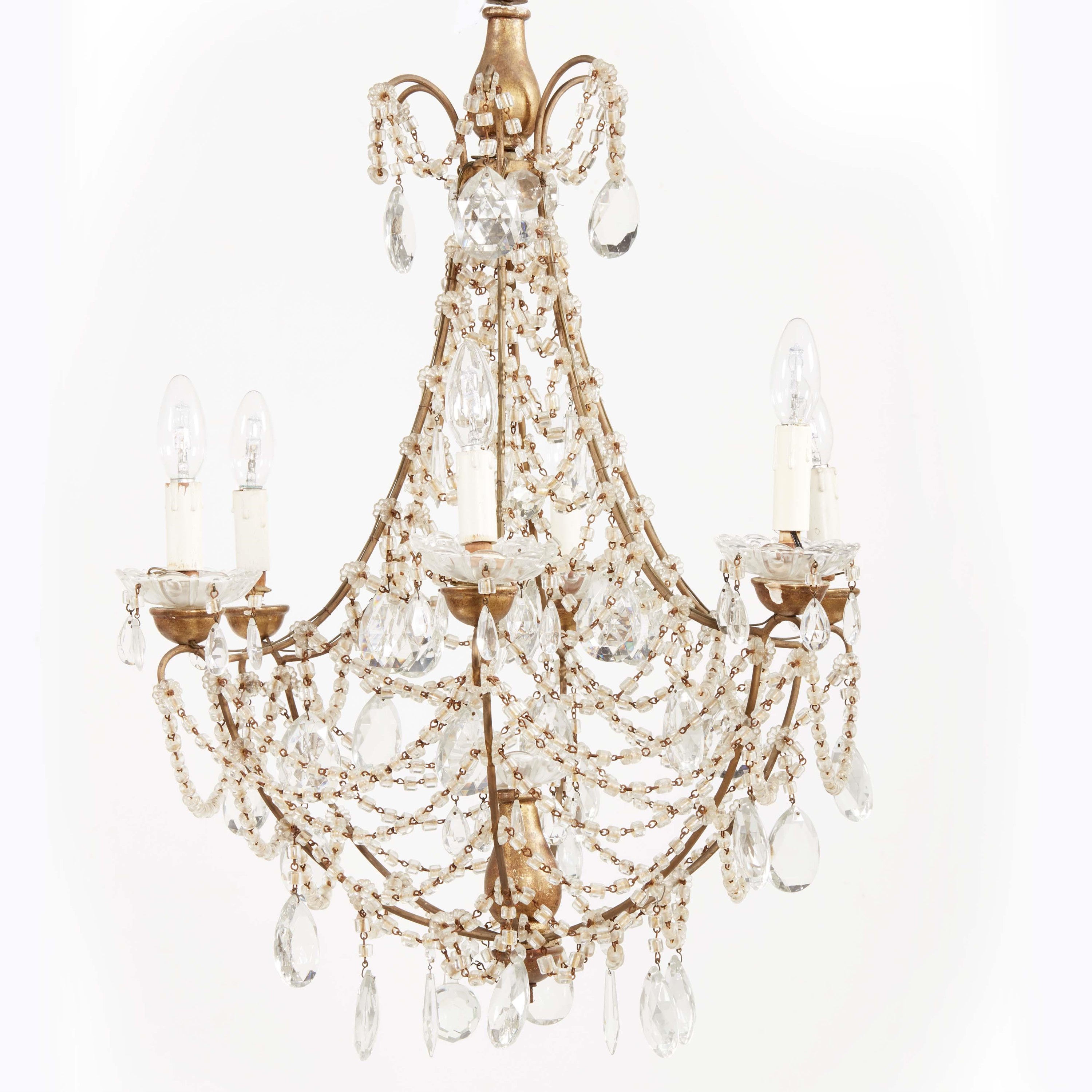 a sei braccia a voluta in ferro dorato, interamente decorato da ghirlande e pendenti in vetro e cristallo, montato ad elettricità, cm 80x66