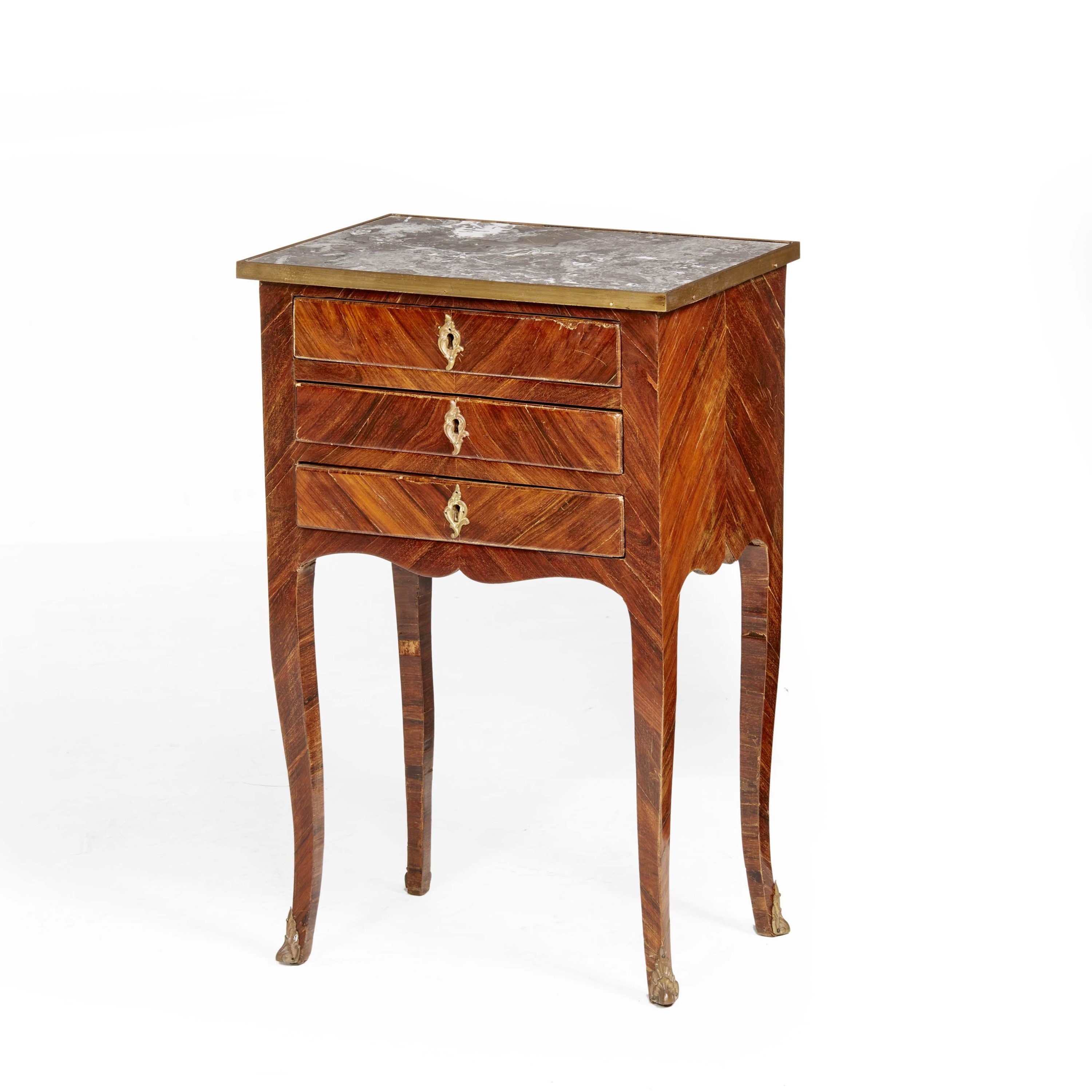 piano in marmo grigio con bordura in metallo dorato, su corpo a tre cassettini con bocchette con decoro rococò, interamente lastronato in bois de rose, pendagline di linea mossa su ogni lato, gambe di linea mossa terminano in piccolo sabot, cm L43,5xP30xH43,5, difetti