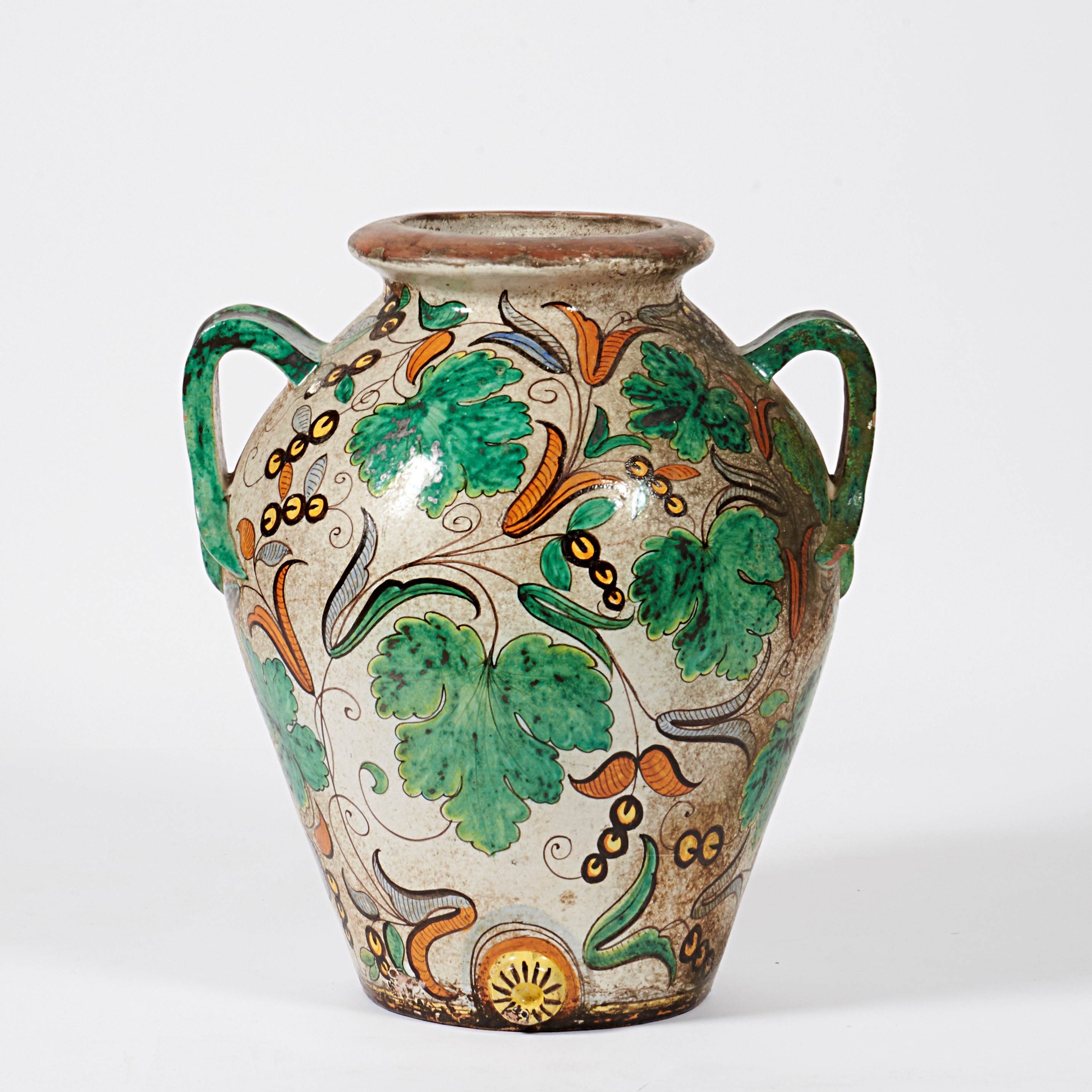 in terraccotta smaltata a foglie e fiori, due manici, cm 53x59, difetti