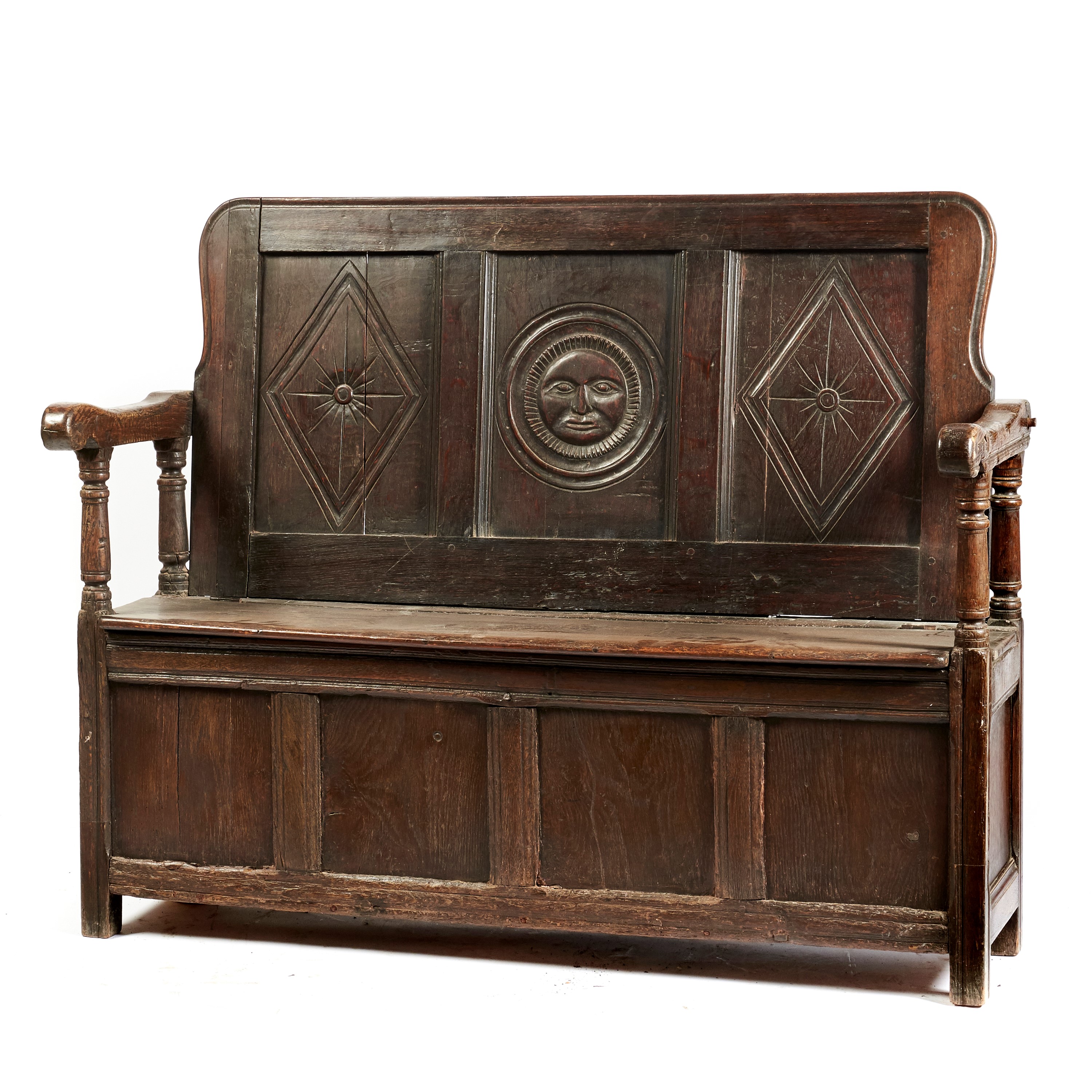 in rovere, schienale a giorno, braccioli mossi, cm L139xP50xH113