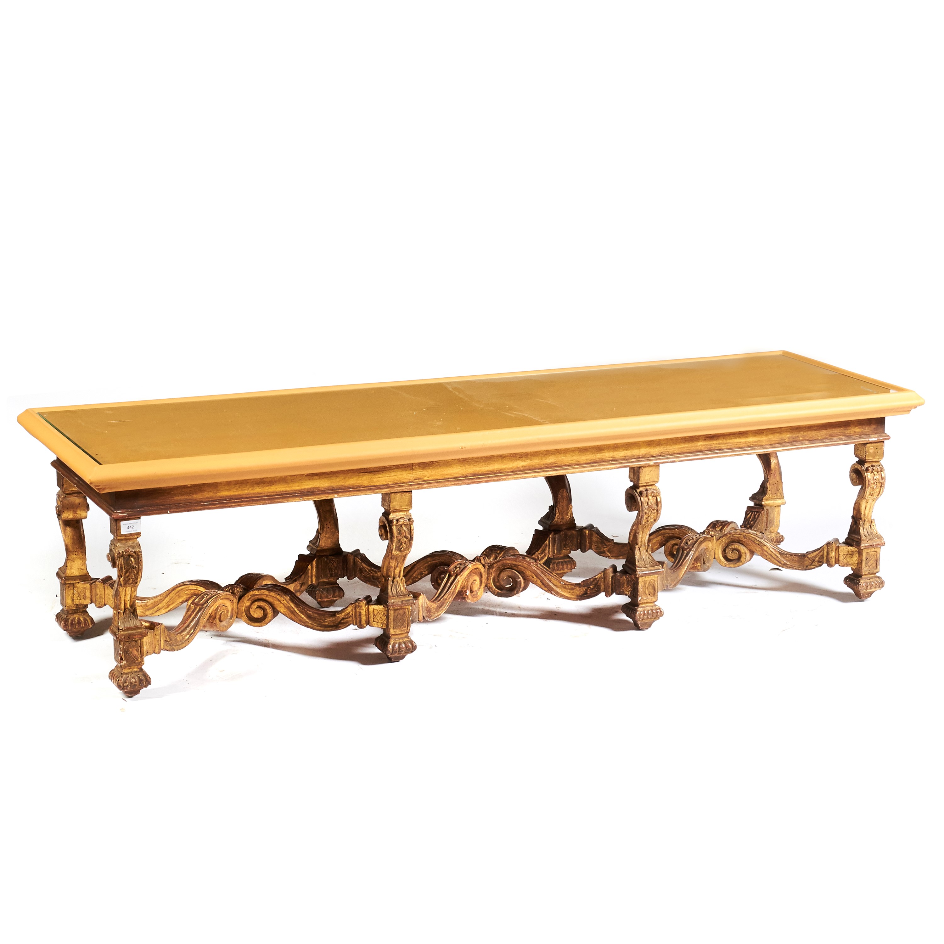 in legno intagliato e dorato, piano rivestito in pelle e vetro, cm L181xP57xH47