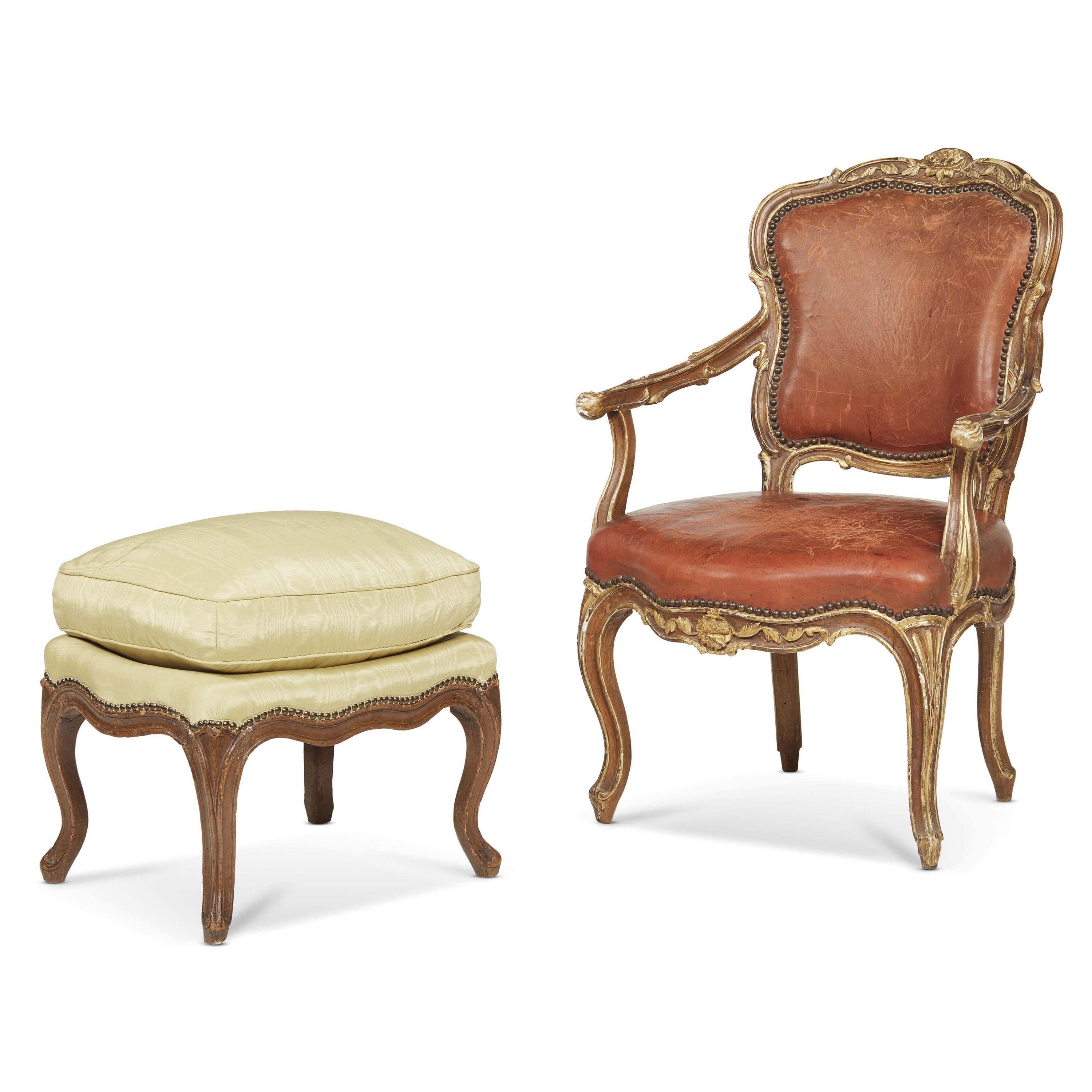 in legno lumeggiato in oro, seduta e schienale rivestiti in cuoio, cartella sagomata profilata da volute a inquadrare al centro superiore fiore, braccioli mossi profilati da foglie, grembiale di linea mossa centrato da fiore tra foglie su gambe mosse terminanti a ricciolo, alt. cm 86,5