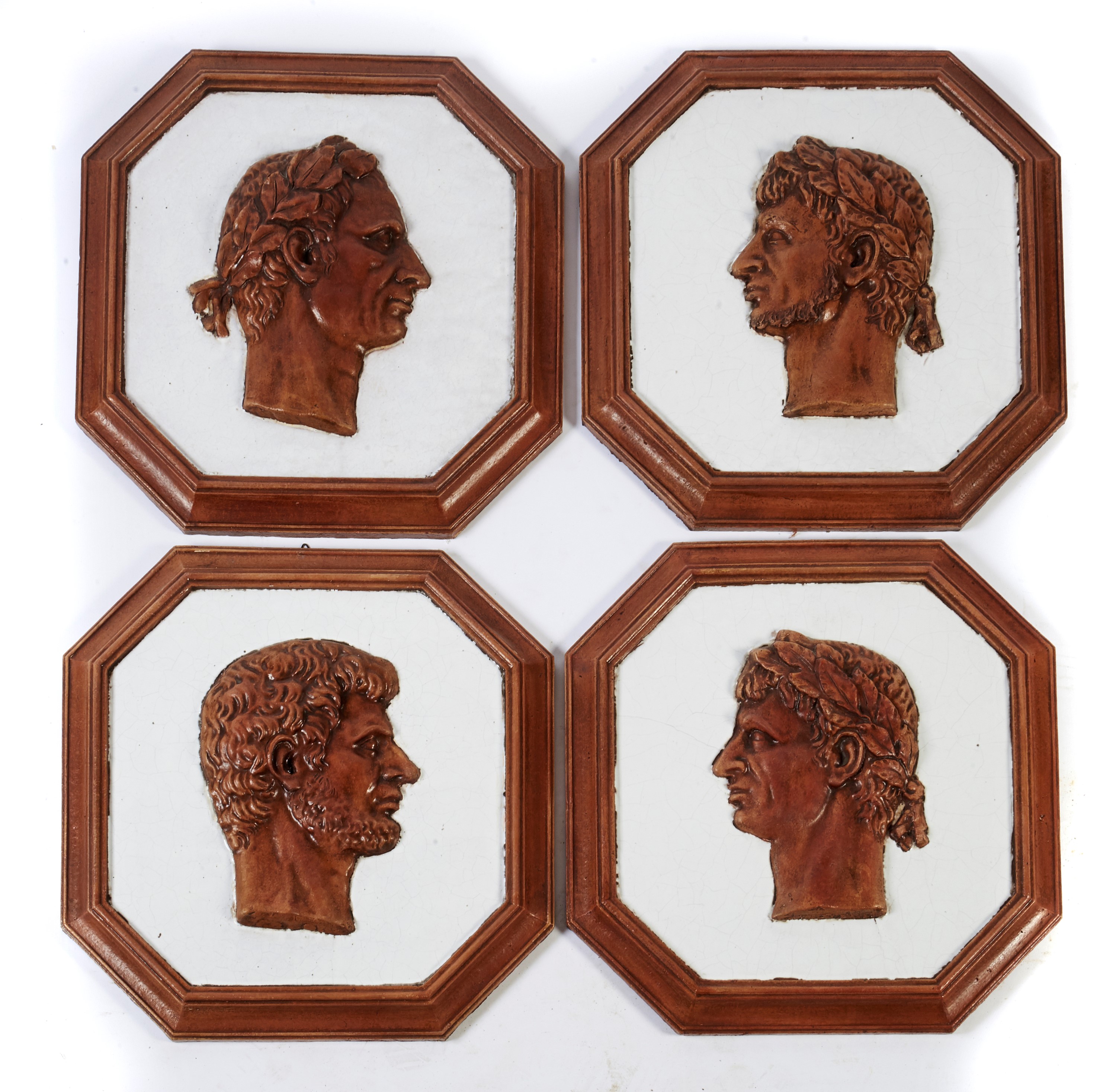 in terracotta invetriata a fondo bianco con ritratti di imperatori, cm 50x50, difetti