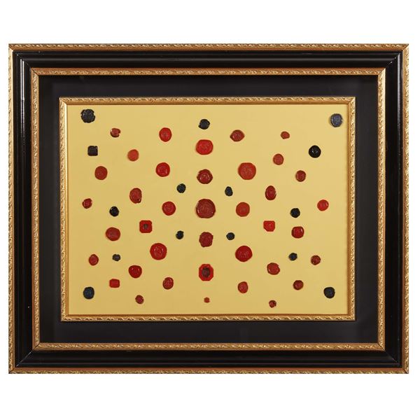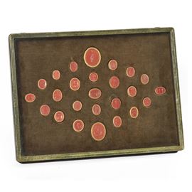 in cera rossa e ceralacca nera e rossa, i primi montati entro bacheca rivestita in pelle verde, teca cm 35x47, i secondi entro due cornici