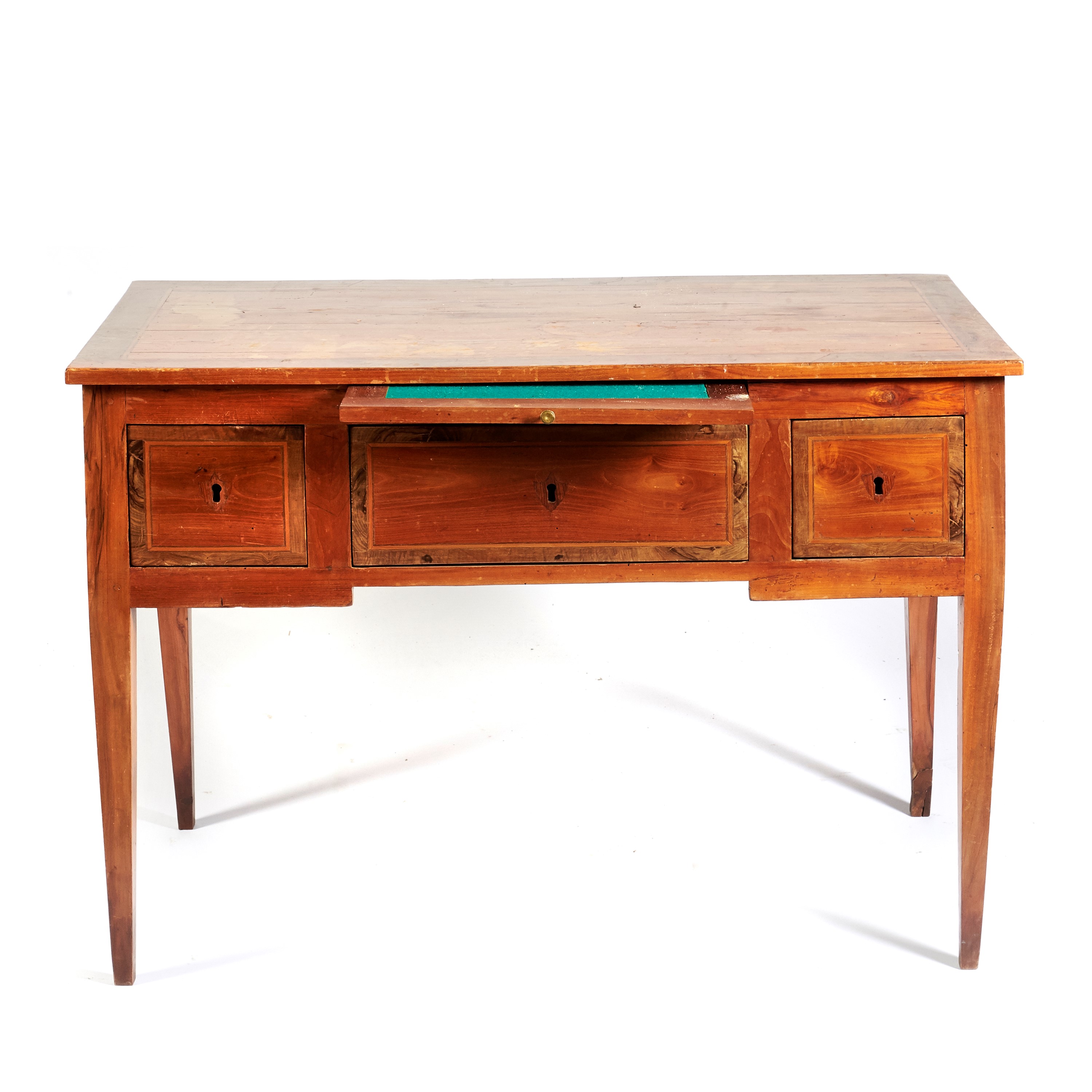 in noce, tre cassetti su ogni lato, gambe troncopiramidali, cm L107xP57xH76, difetti