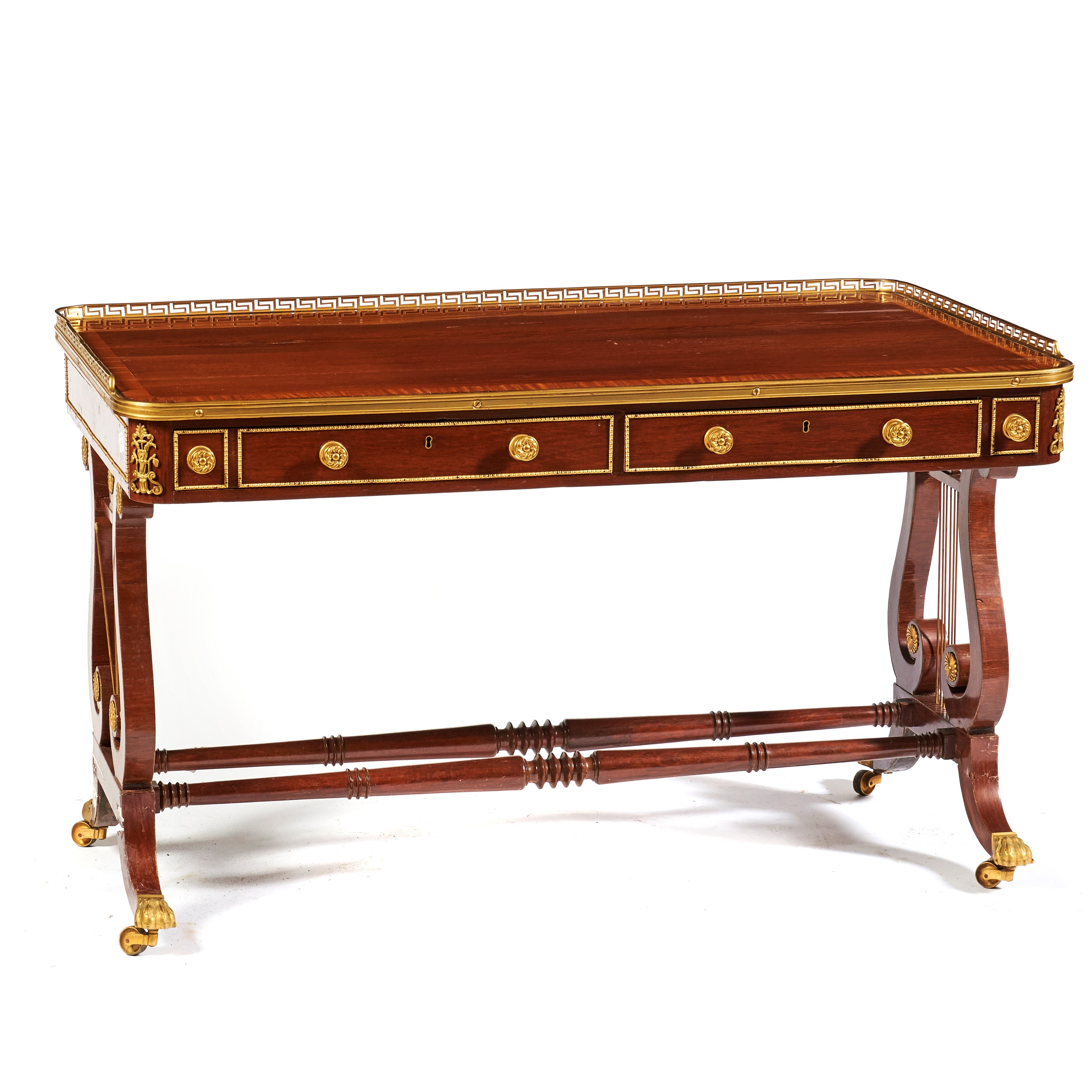 in mogano con applicazioni in bronzo dorato, due cassetti, gambe a lira, piedi a rotelle, cm L123xP73xH76, da restaurare