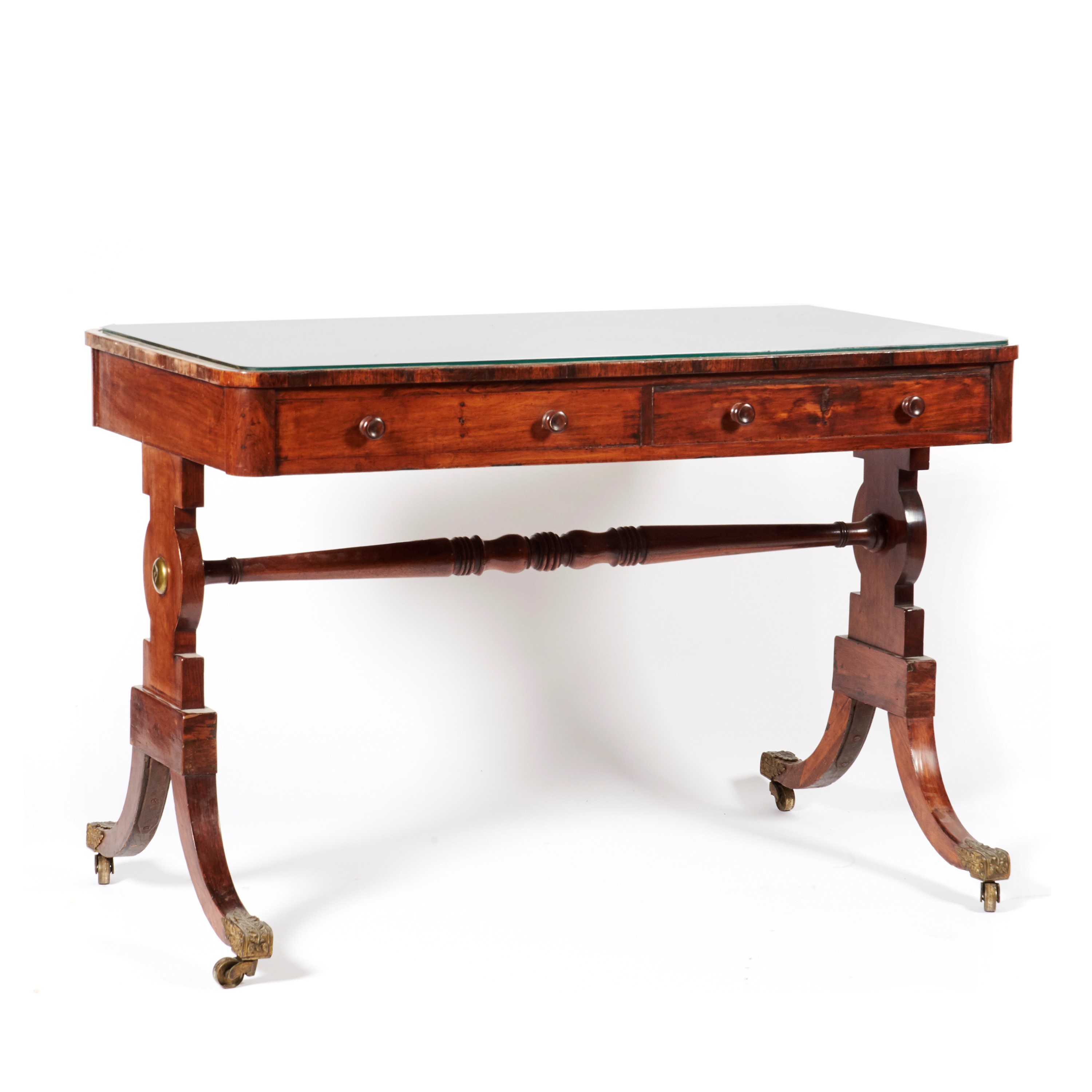 in noce, piano rettangolare con angoli stondati, fascia a quattro cassetti, piedini a rotelle, cm L116xP67xH80