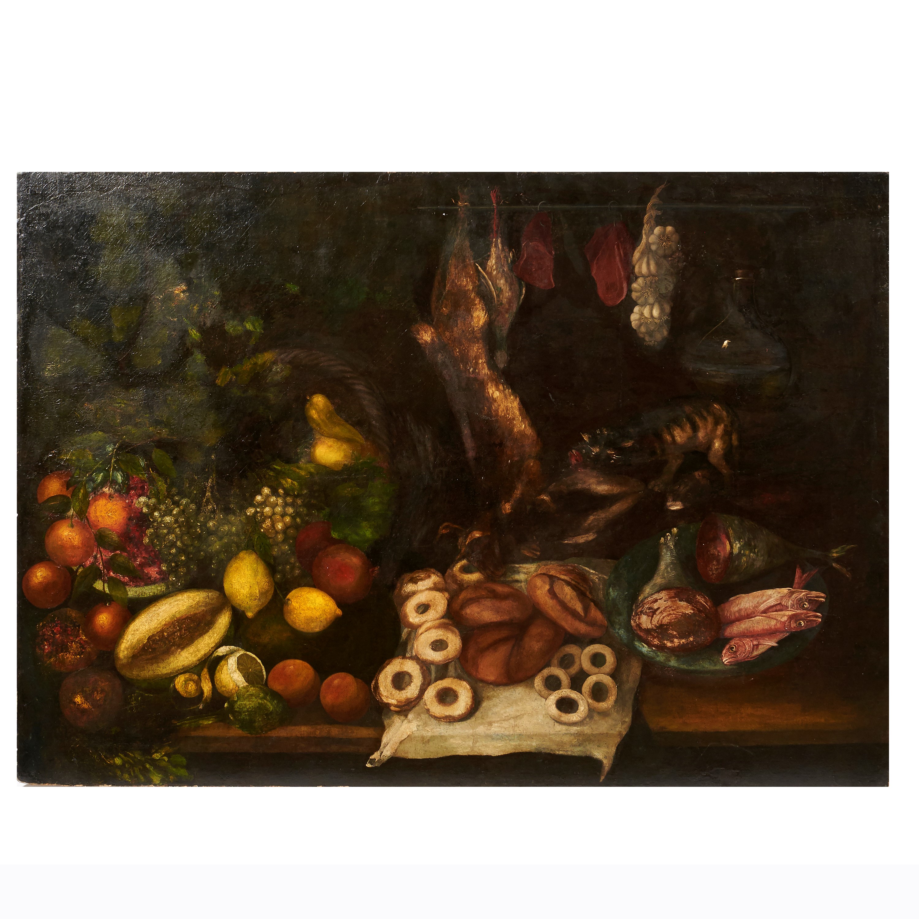 NATURA MORTA CON CESTO DI FRUTTA, PANE, BISCOTTI, VASSOIO DI PESCE, CACCIAGIONE E GATTO