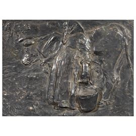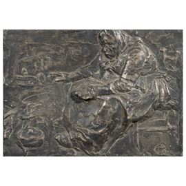 due bassorilievi in bronzo, cm 29,5x21 e cm 38x28,5, applicati su pannelli in truciolato, uno siglato