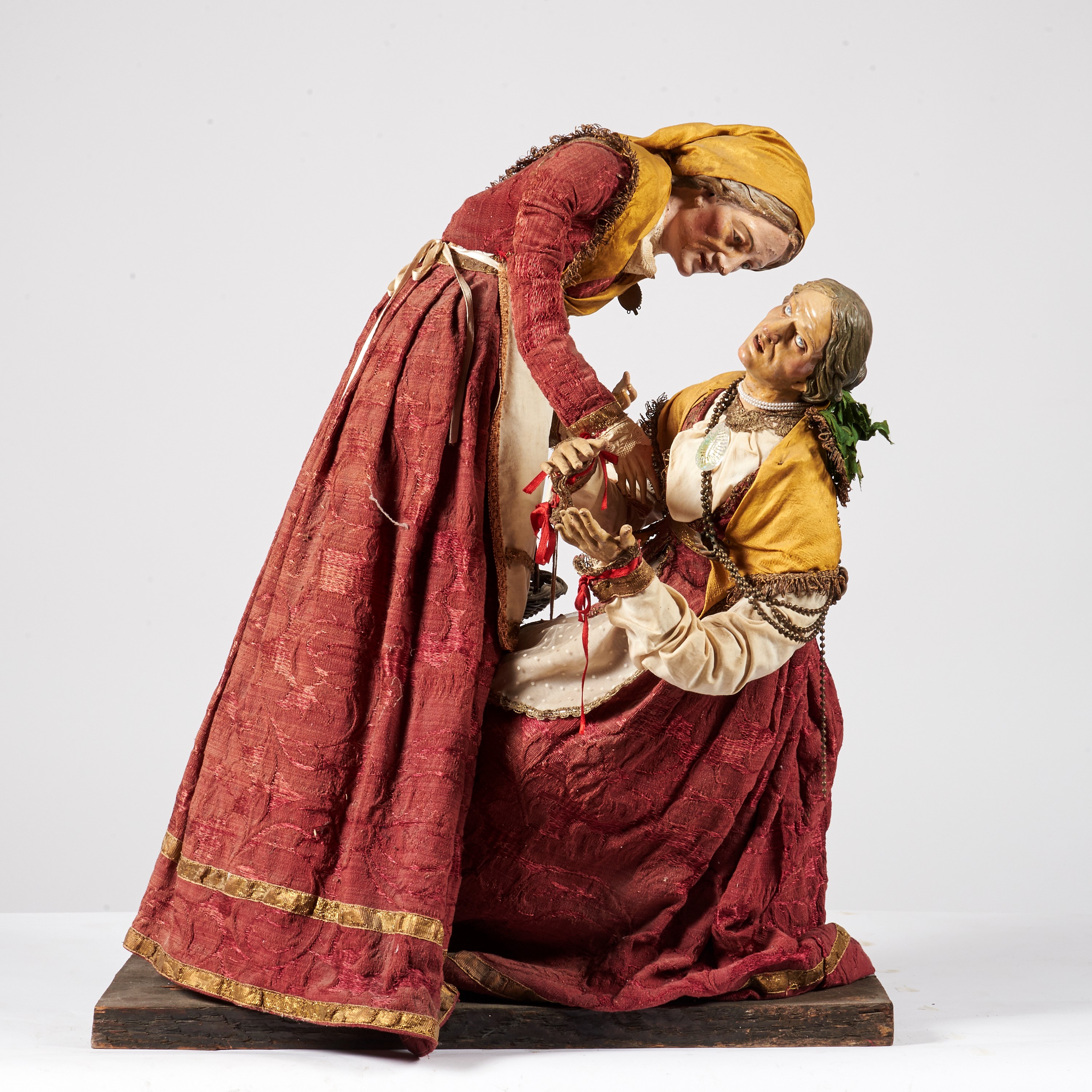 due personaggi da presepe, in legno laccato e stoffa, cm L55xP28xH66