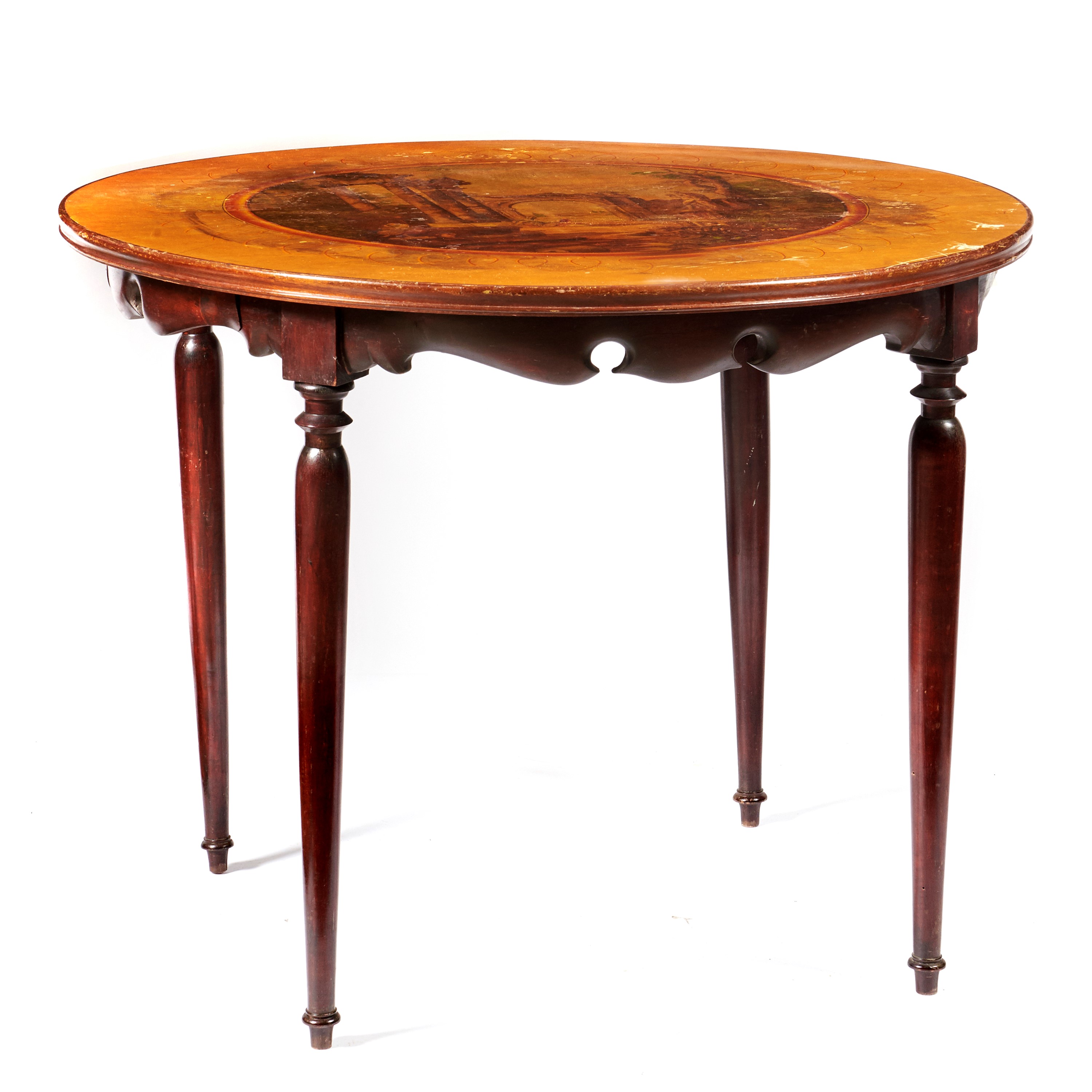 in mogano, con piano decorato a paesaggio, cm 90x72