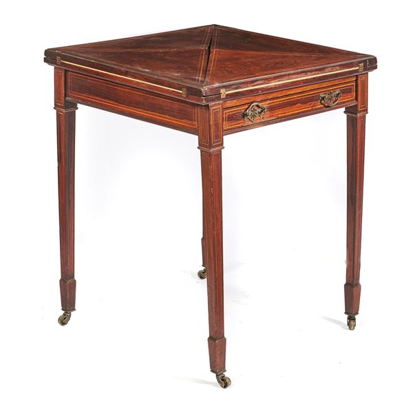 in mogano filettato, piano da aprirsi a quattro spicchi, piedini a rotelle, chiuso cm L60xP60xH73, aperto cm L84,5xP84,5xH73, difetti