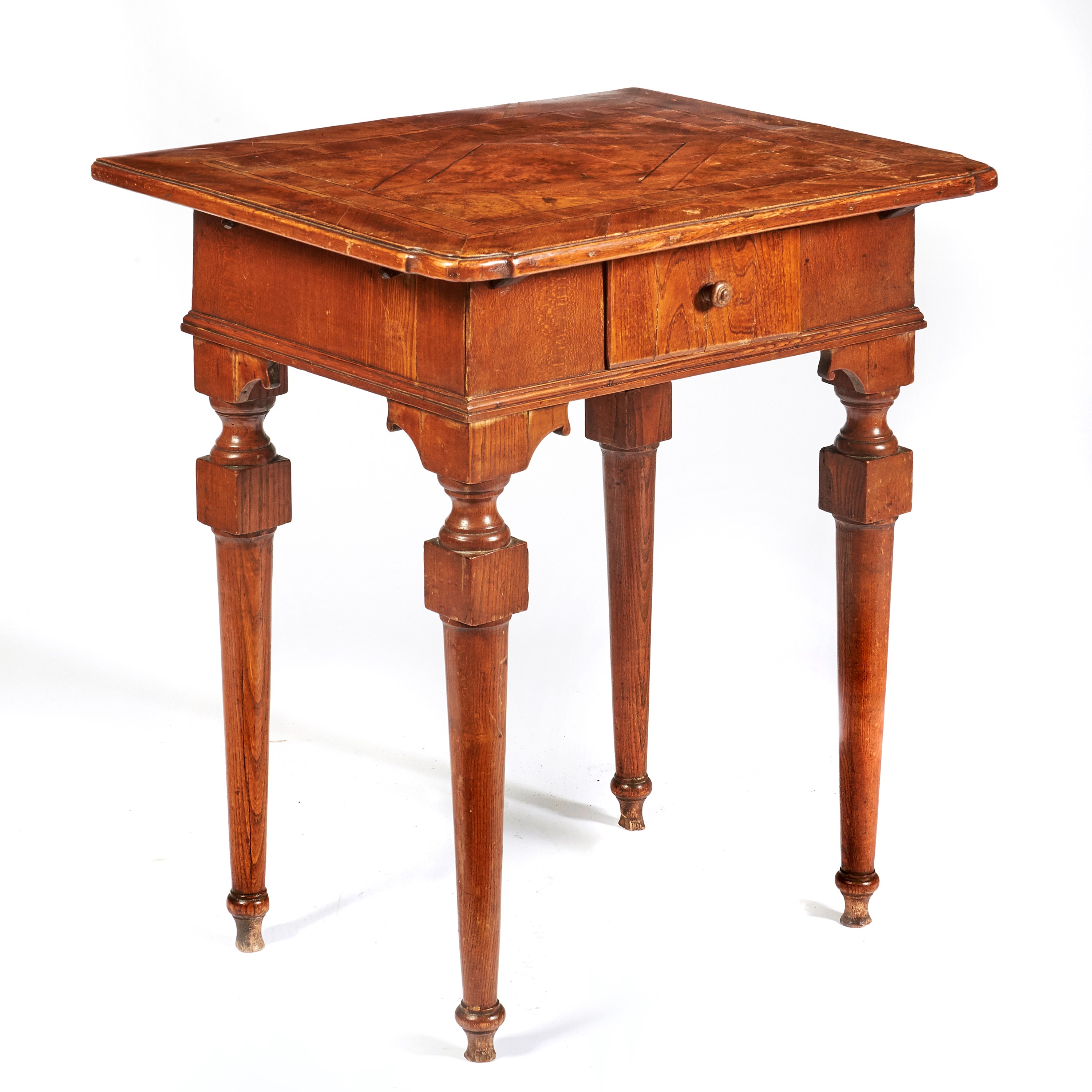 piano in noce intarsiato, fusto e gambe tornite in rovere, un cassetto, cm L66xP52xH77