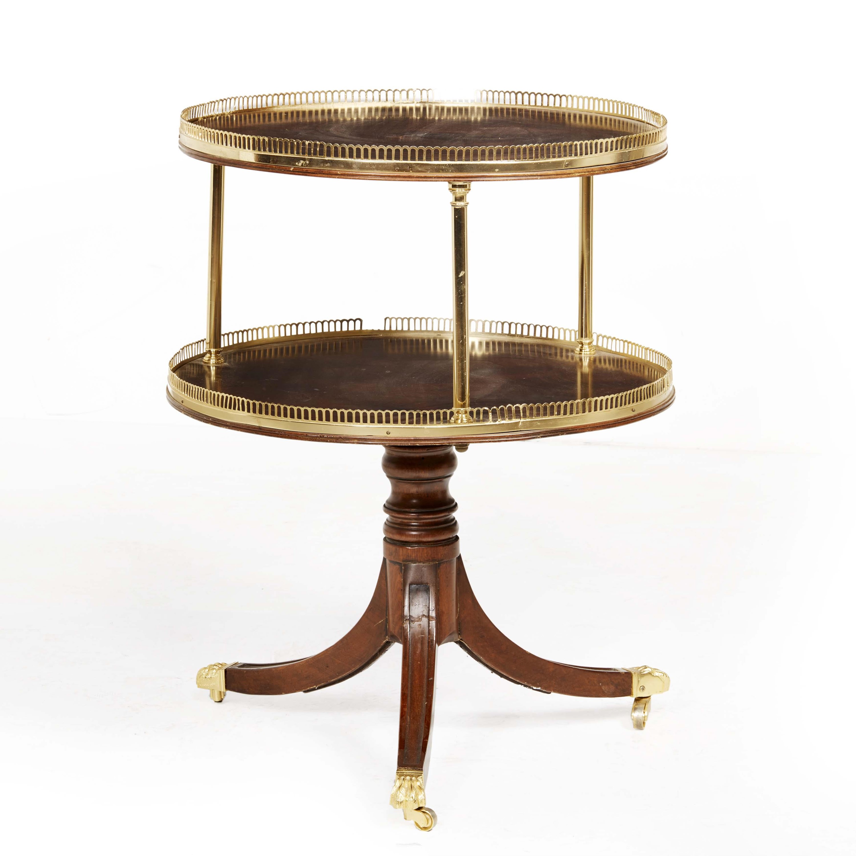 in mogano, a due ripiani circolari decorati da ringhiera traforata in ottone, piete tripode su rotella, cm 80x62, difetti