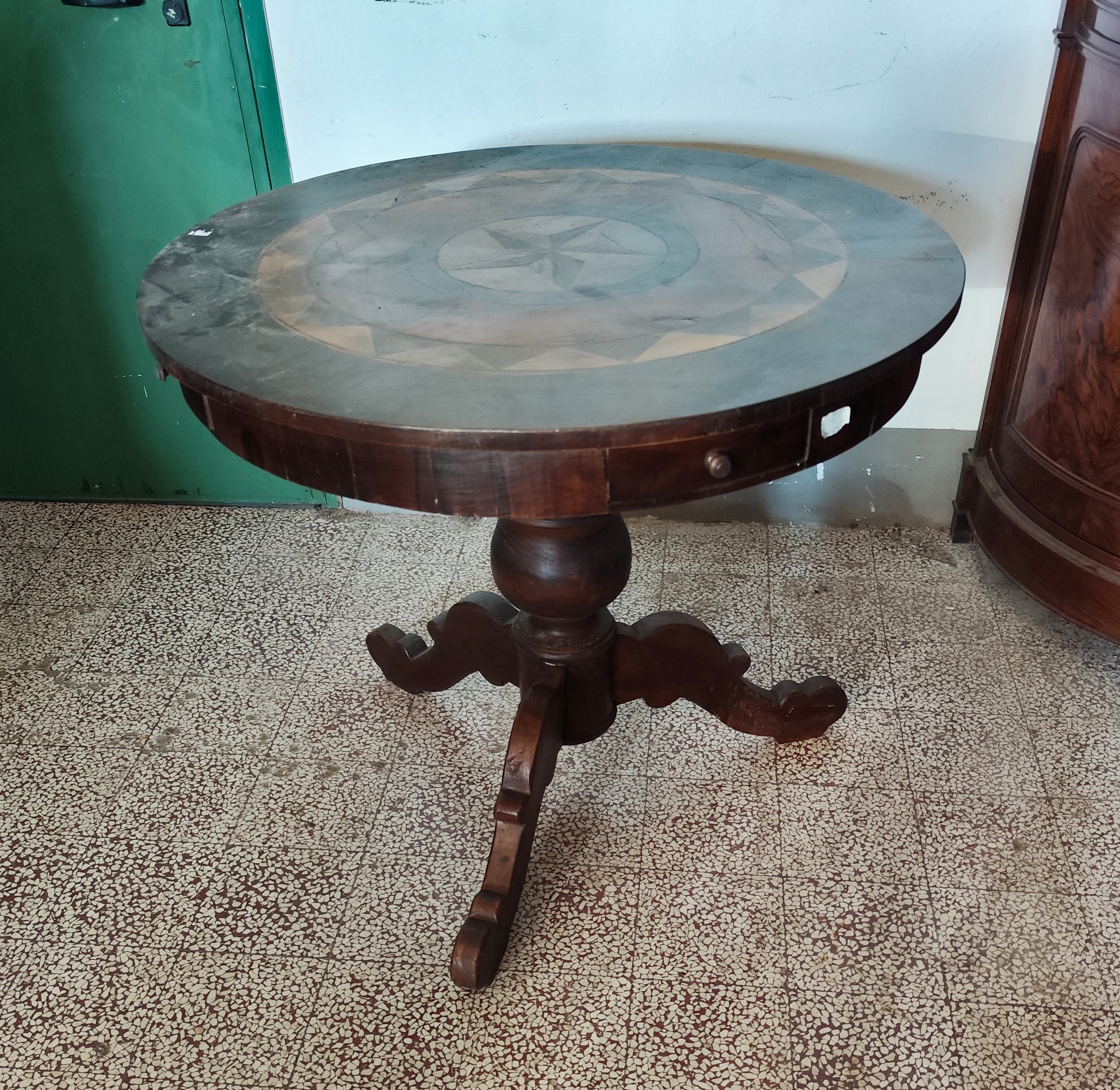 in noce, con piano intarsiato, quattro cassetti, diam. cm 90, alt. cm 80