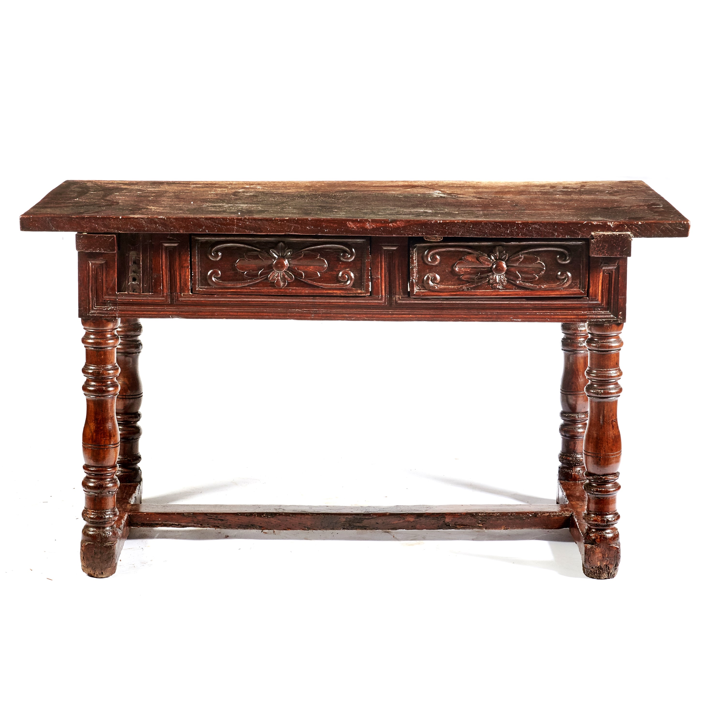 in pioppo intagliato, due cassetti, gambe tornite riunite da traverse, cm L146xP72xH83, difetti