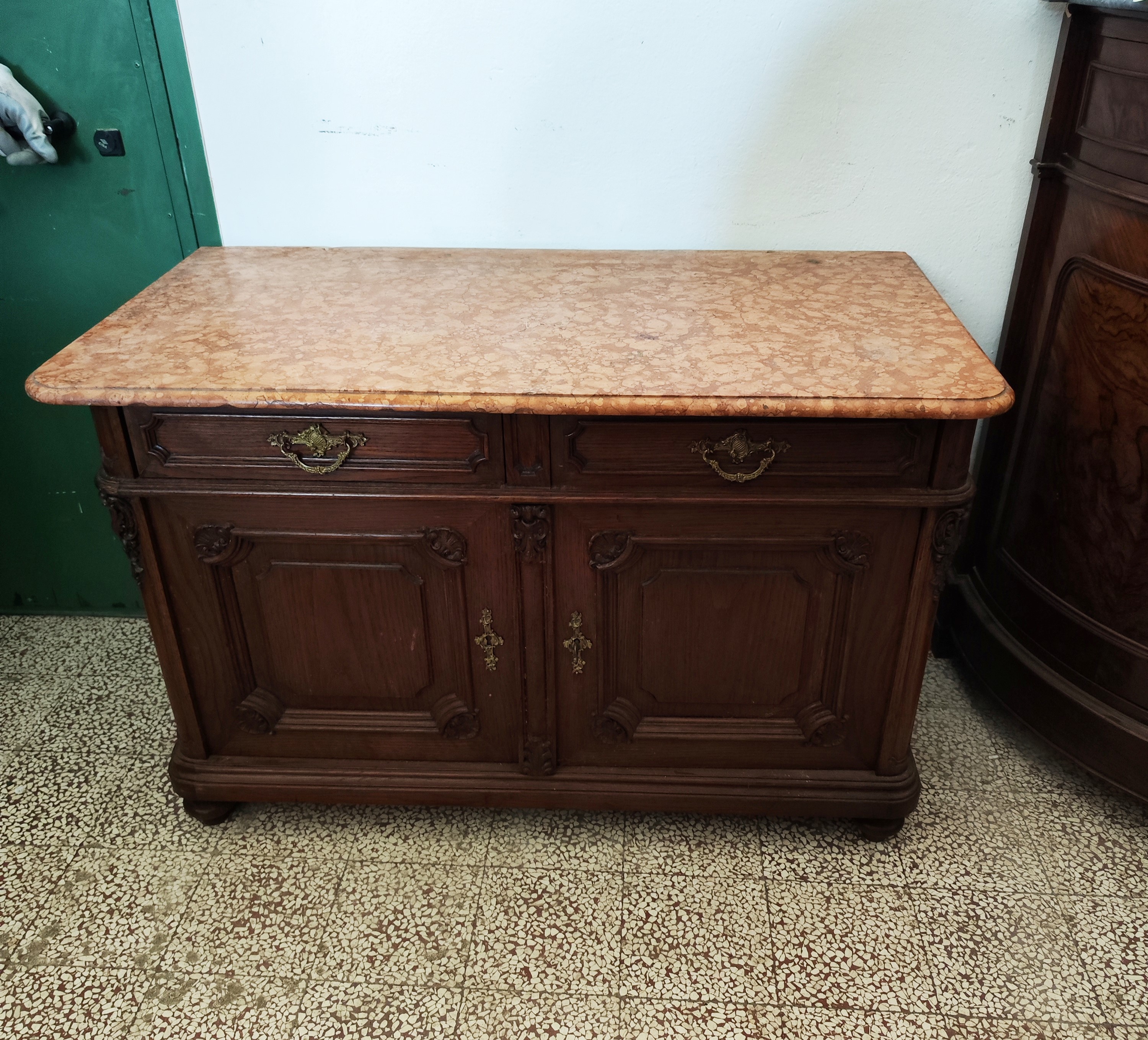 in rovere a due sportelli, due cassetti, piano in marmo, cm L113xP59xH73