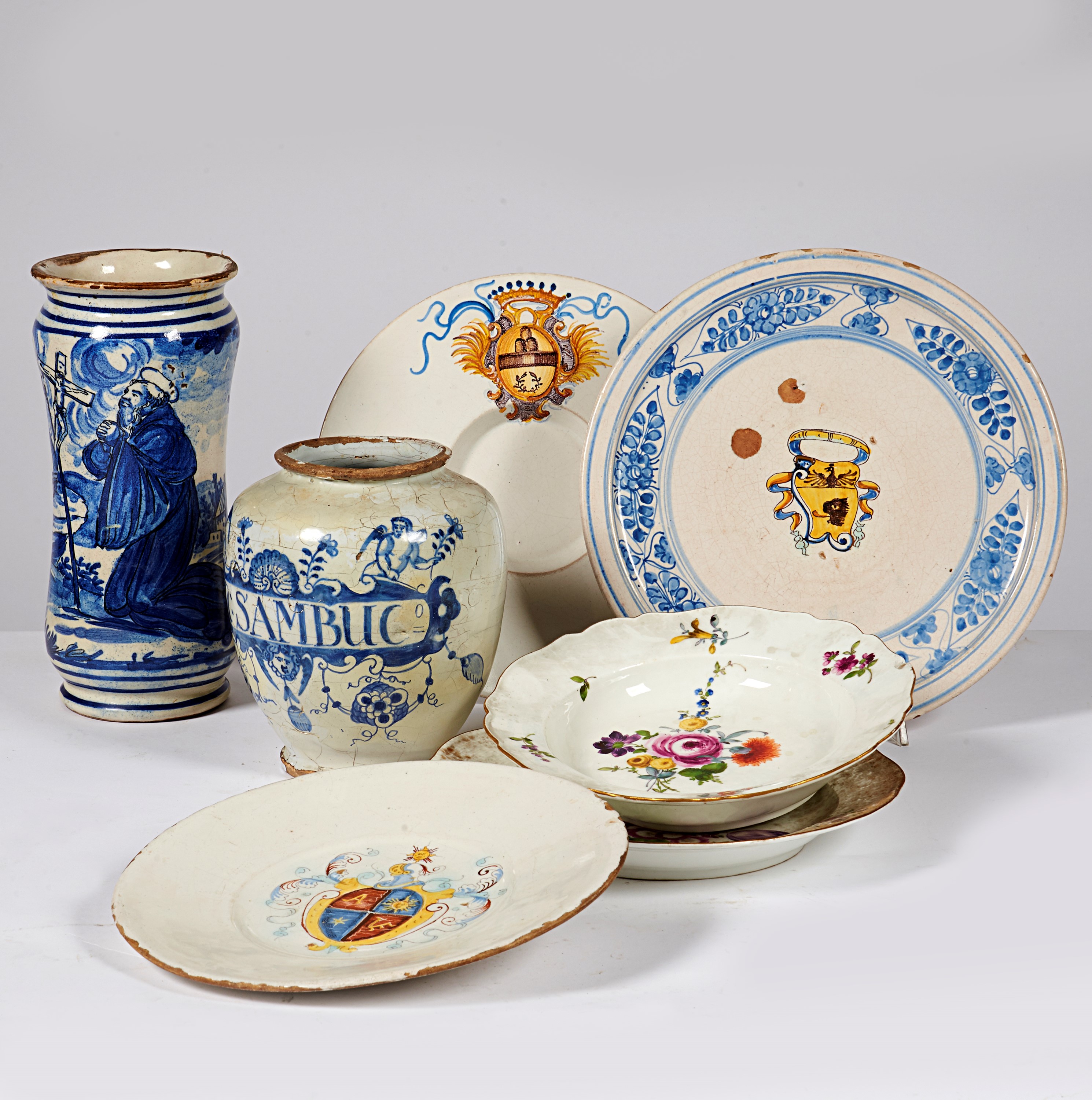 Tre piatti, un albarello ed un orciolo, in stile dei sec. XVII e XVIII