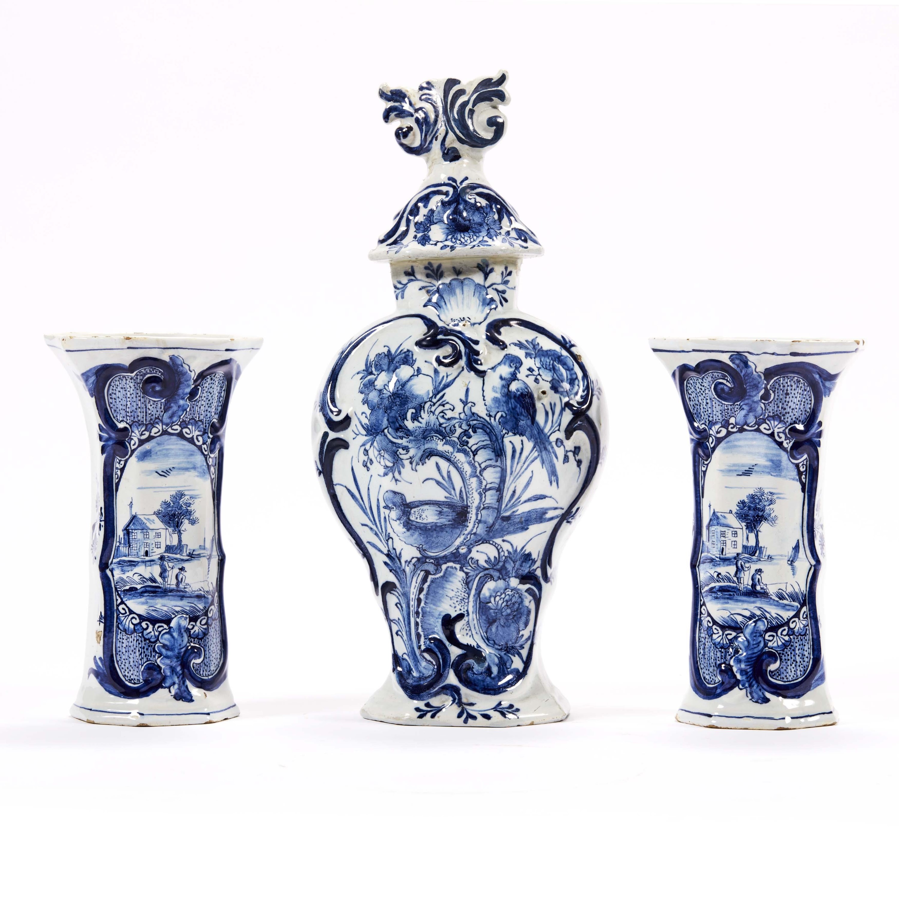 in maiolica monocroma azzurra, raffigurano cartouches con all’interno paesaggio di campagna e la grande decorata a grande cartouche con vegetazione, alt. cm 34,5 e cm 21 i vasetti, difetti