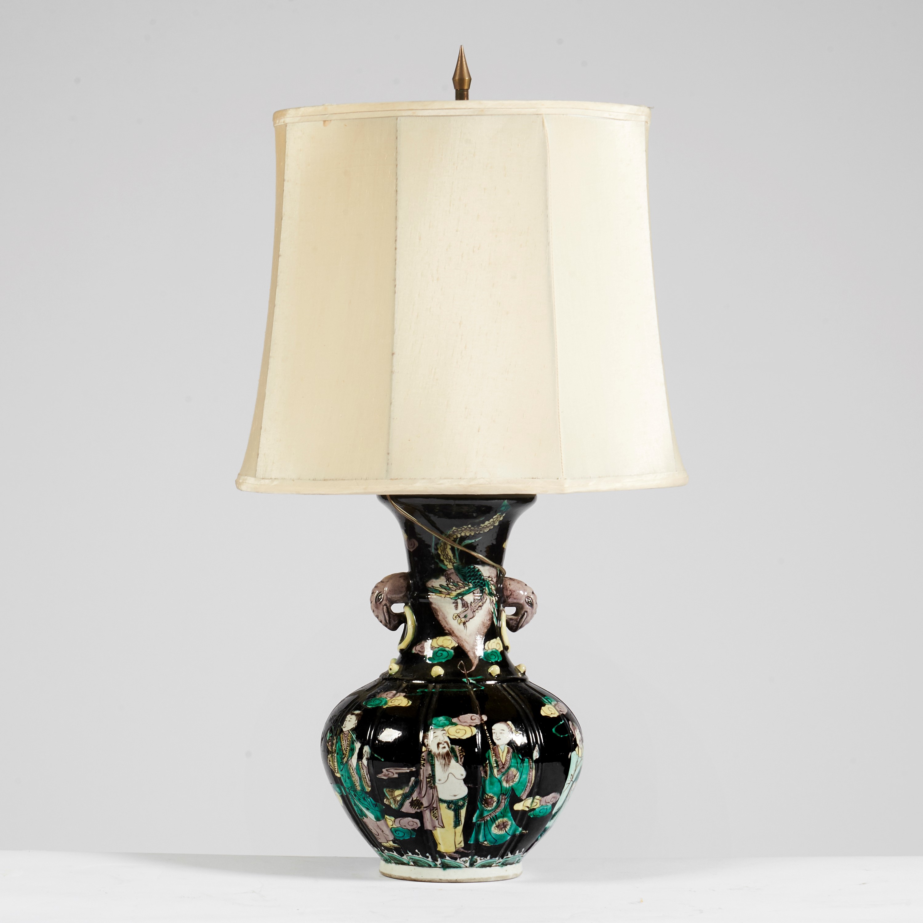 in porcellana policroma, montato a lampada, completo di paralume, alt. cm 57, difetti