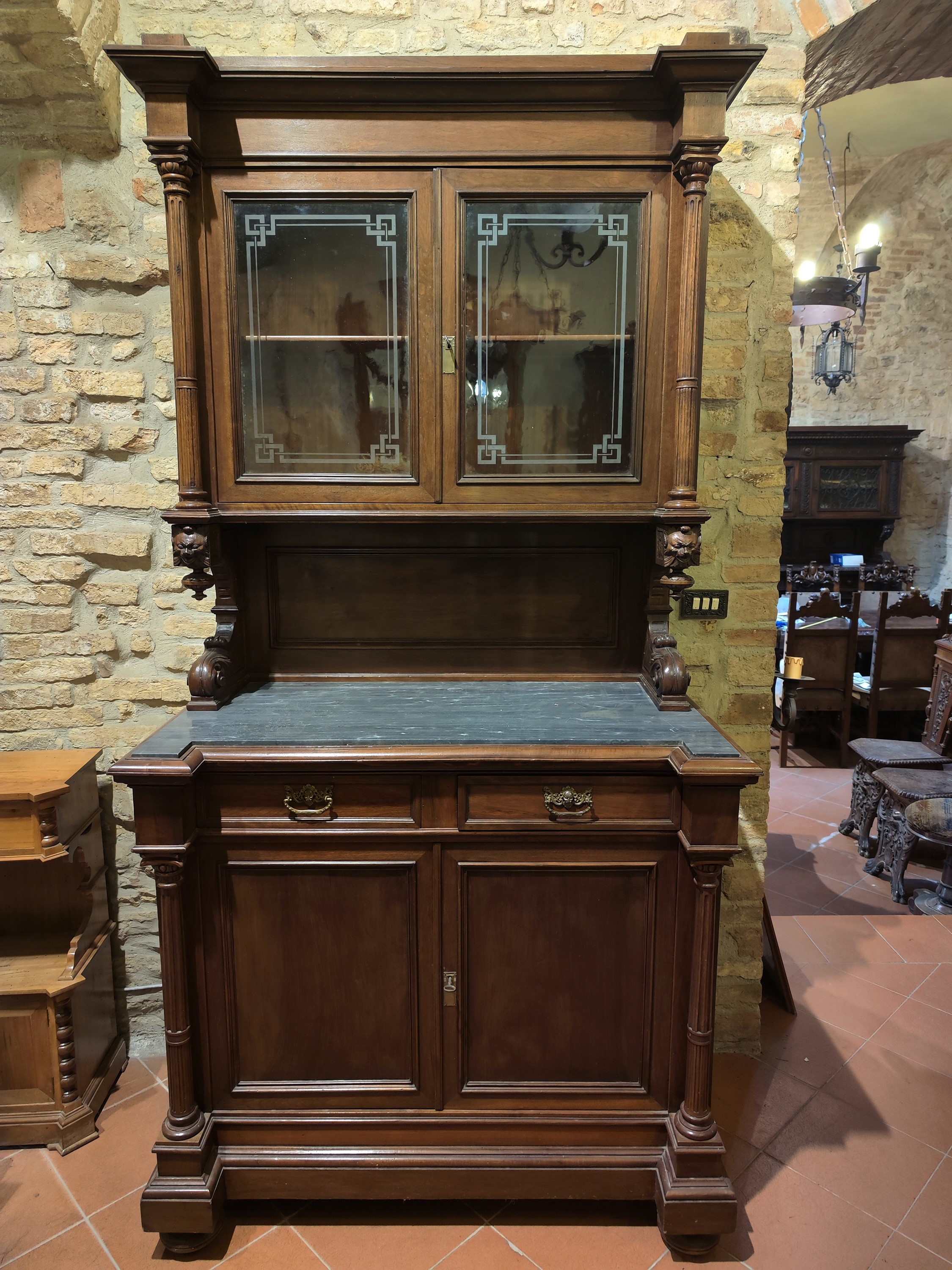 in noce, quattro sportelli due dei quali in vetro e piano in marmo e due cassetti, cm L120xP67xH236
