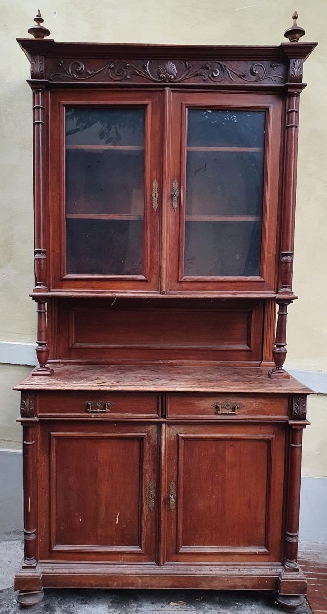 a due corpi in noce, quattro sportelli due dei quali in vetro, due cassetti, cm 126x58x260