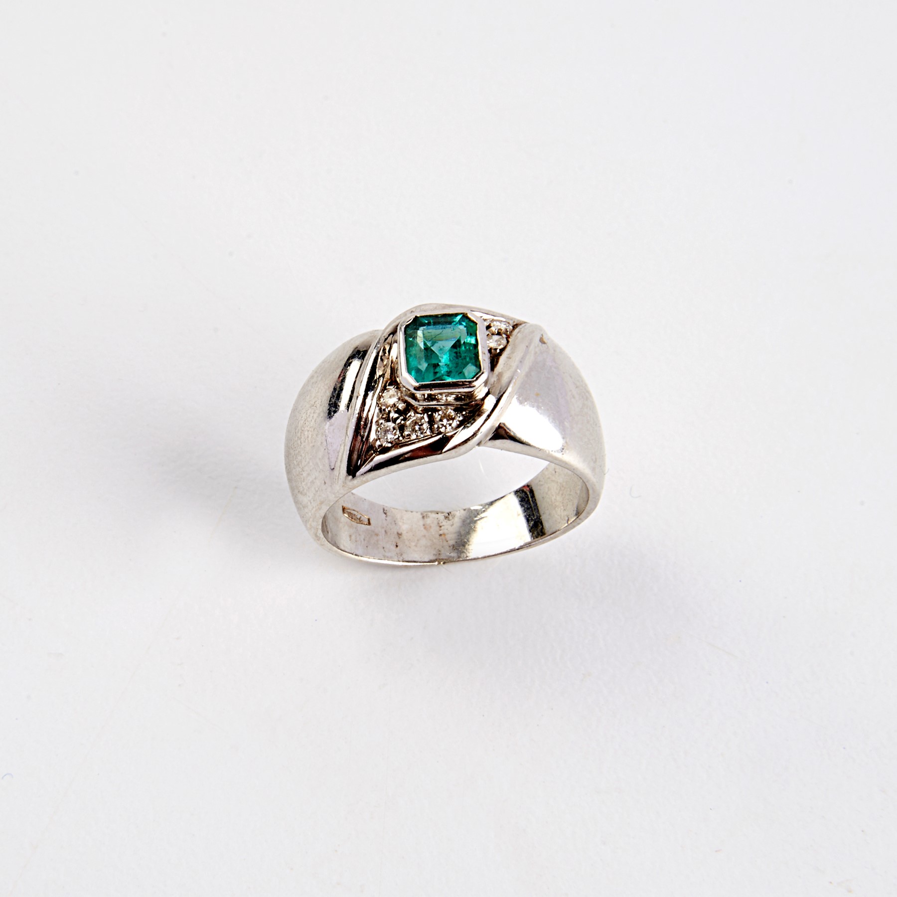 ANELLO IN ORO BIANCO 18KT, DIAMANTI E SMERALDO