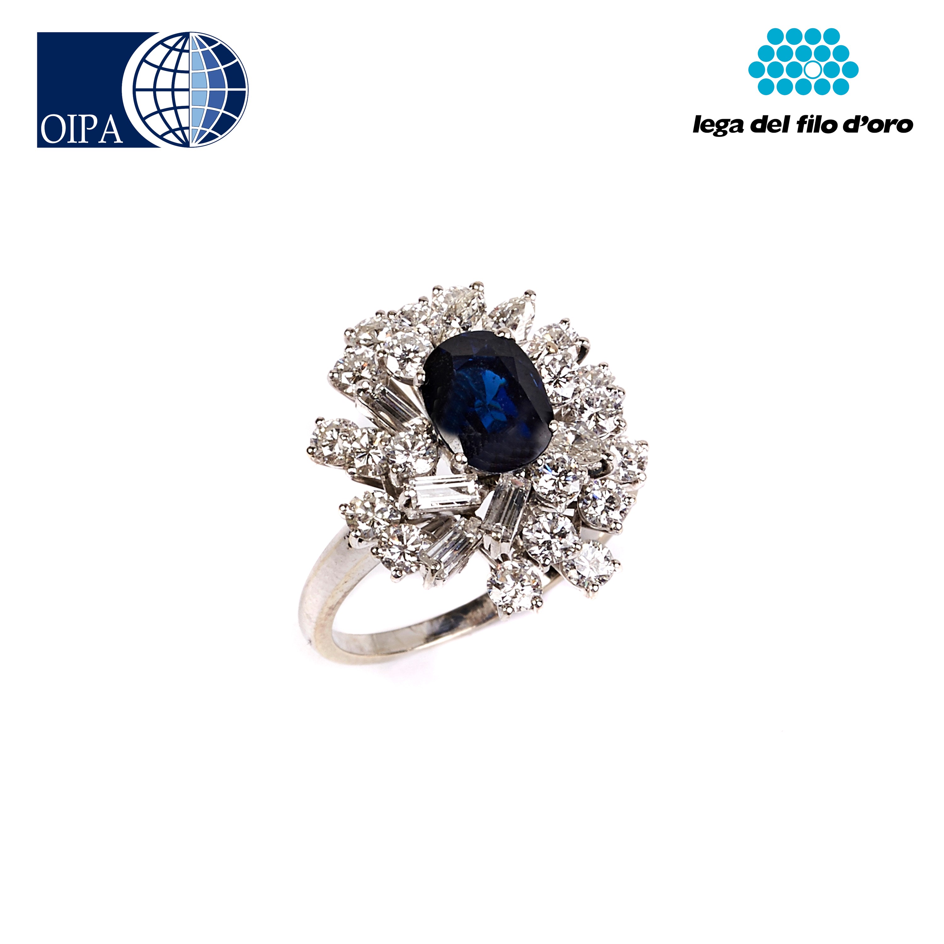 al centro uno zaffiro di ct 2, cornice di brillanti e baguette di ct 2,20, colore G/H, purezza VVS-SI, g 5,9, misura 15.