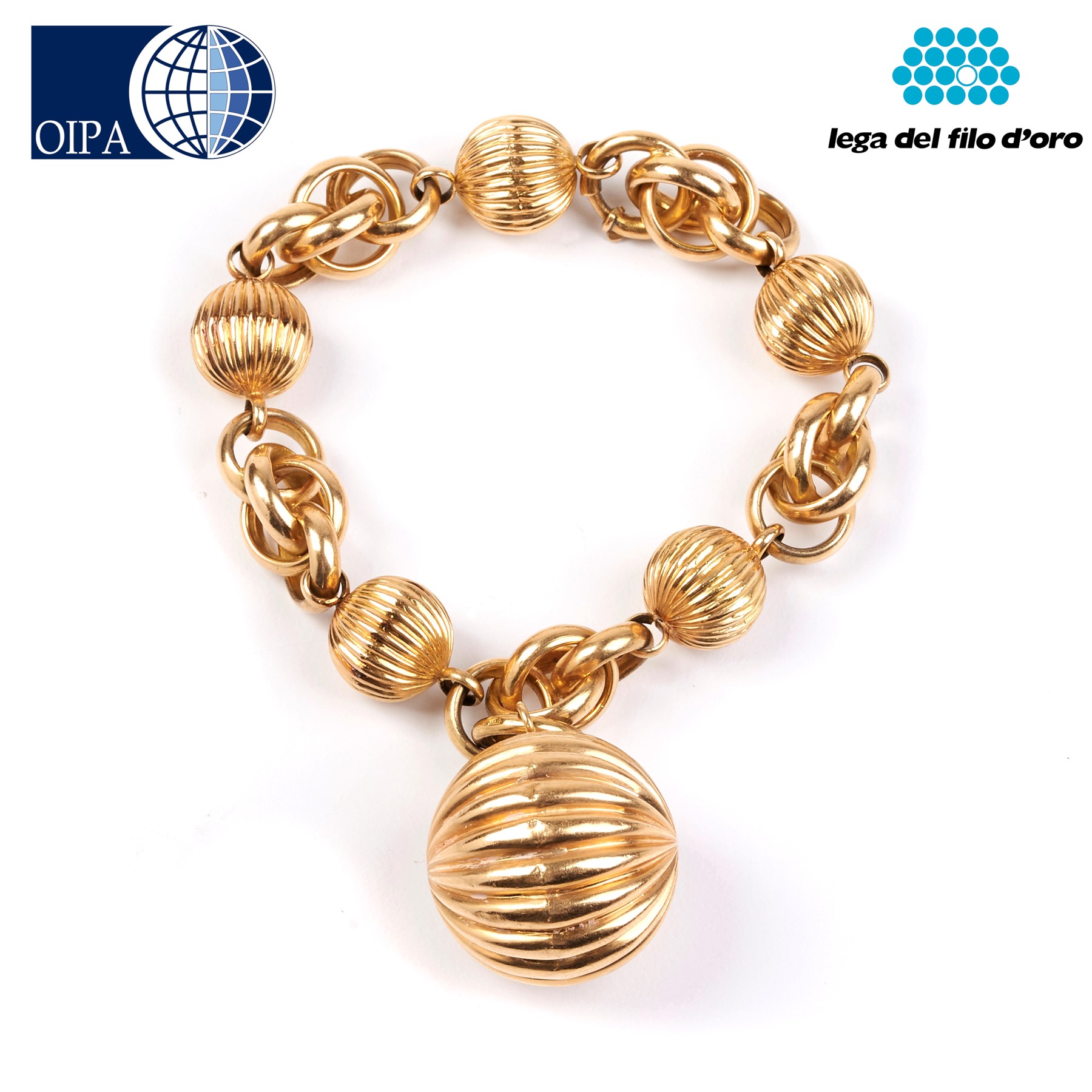 realizzato a maglie intrecciate, alternato da cinque sfere scanalate, e pendente a sfera scanalata, lungh. cm 19 g 32,9