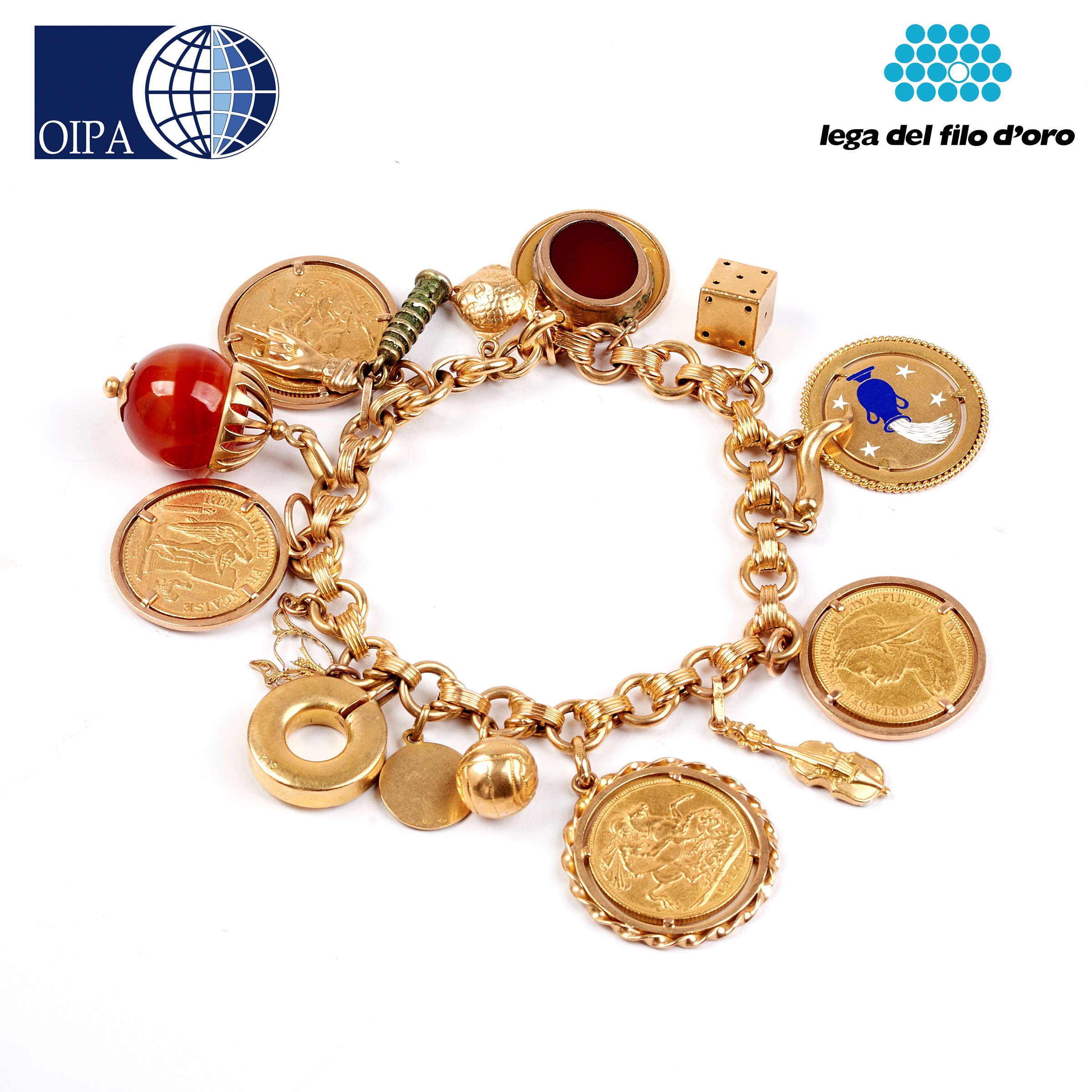 BRACCIALE IN ORO GIALLO 18KT, CHARMS E MONETE
