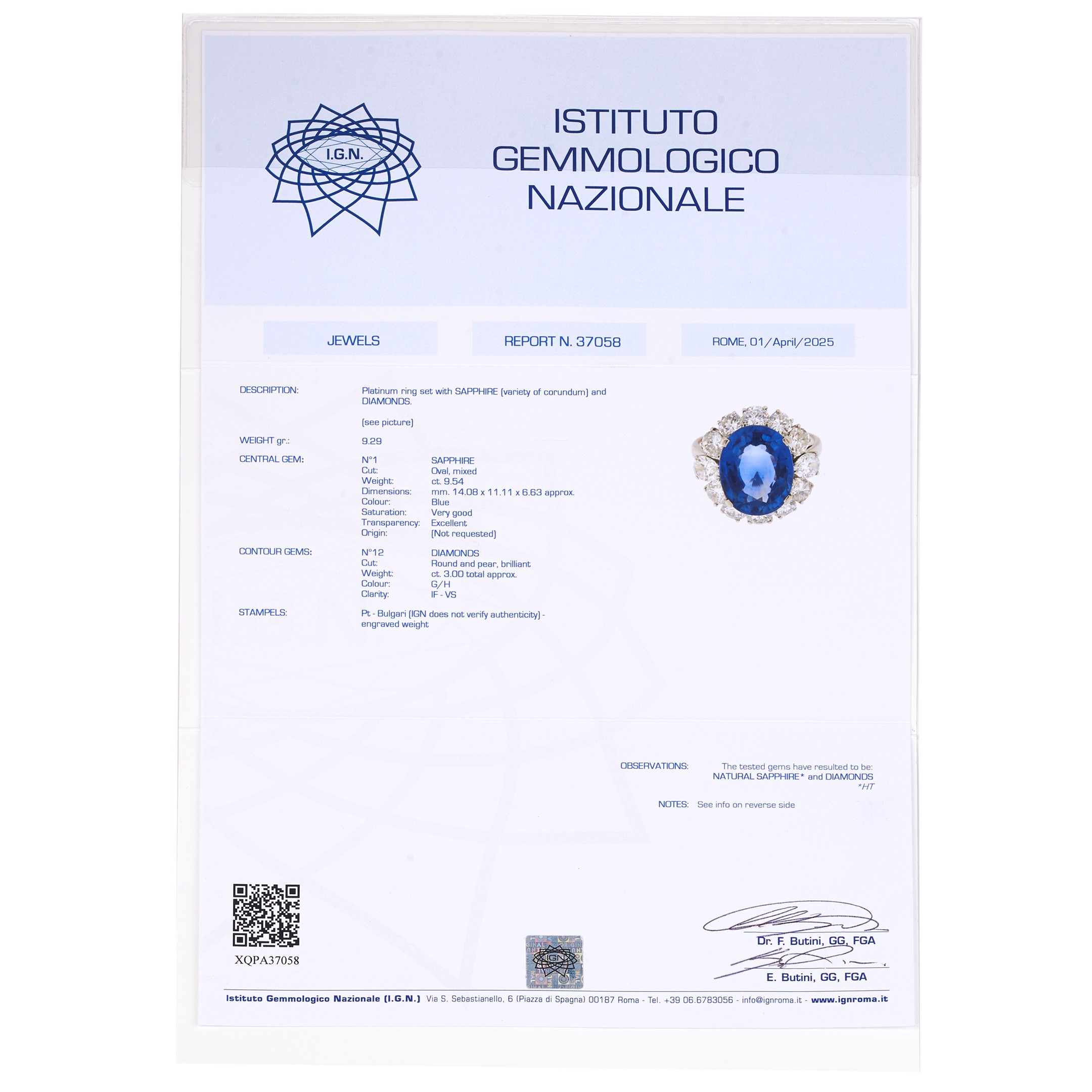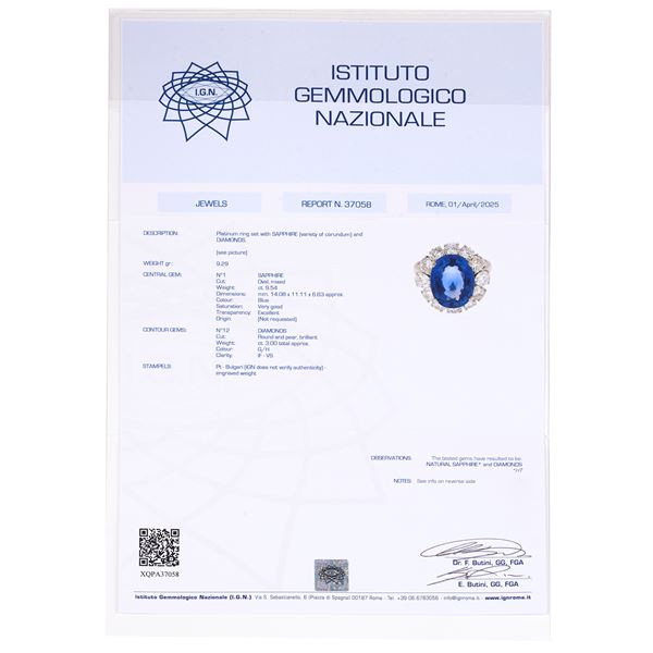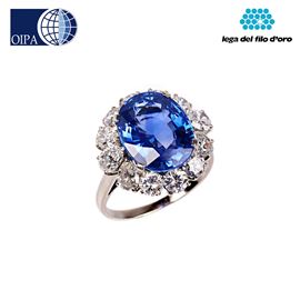 al centro uno zaffiro ovale di ct 9,54 e cornice di brillanti per complessivi ct 3, colore G/H, purezza IF-VS, g 9,3, misura 16. zaffiro con trattamento termico Corredato di certificato gemmologico IGN del 01/04/25 attestante le caratteristiche delle pietre