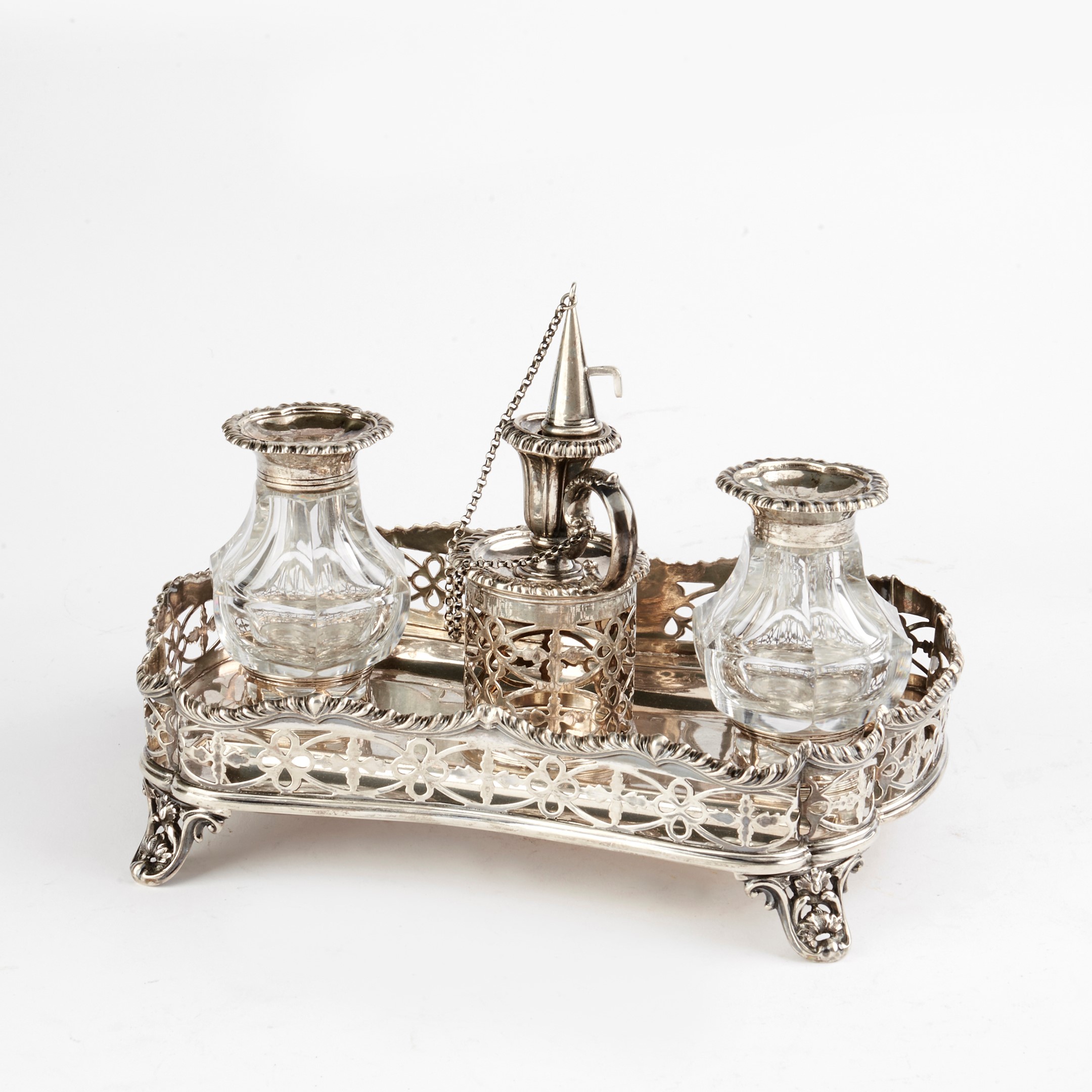 in argento, completo di due contenitori in cristallo, base rettangolare sagomata, cm 24x16x14, g 645 netti