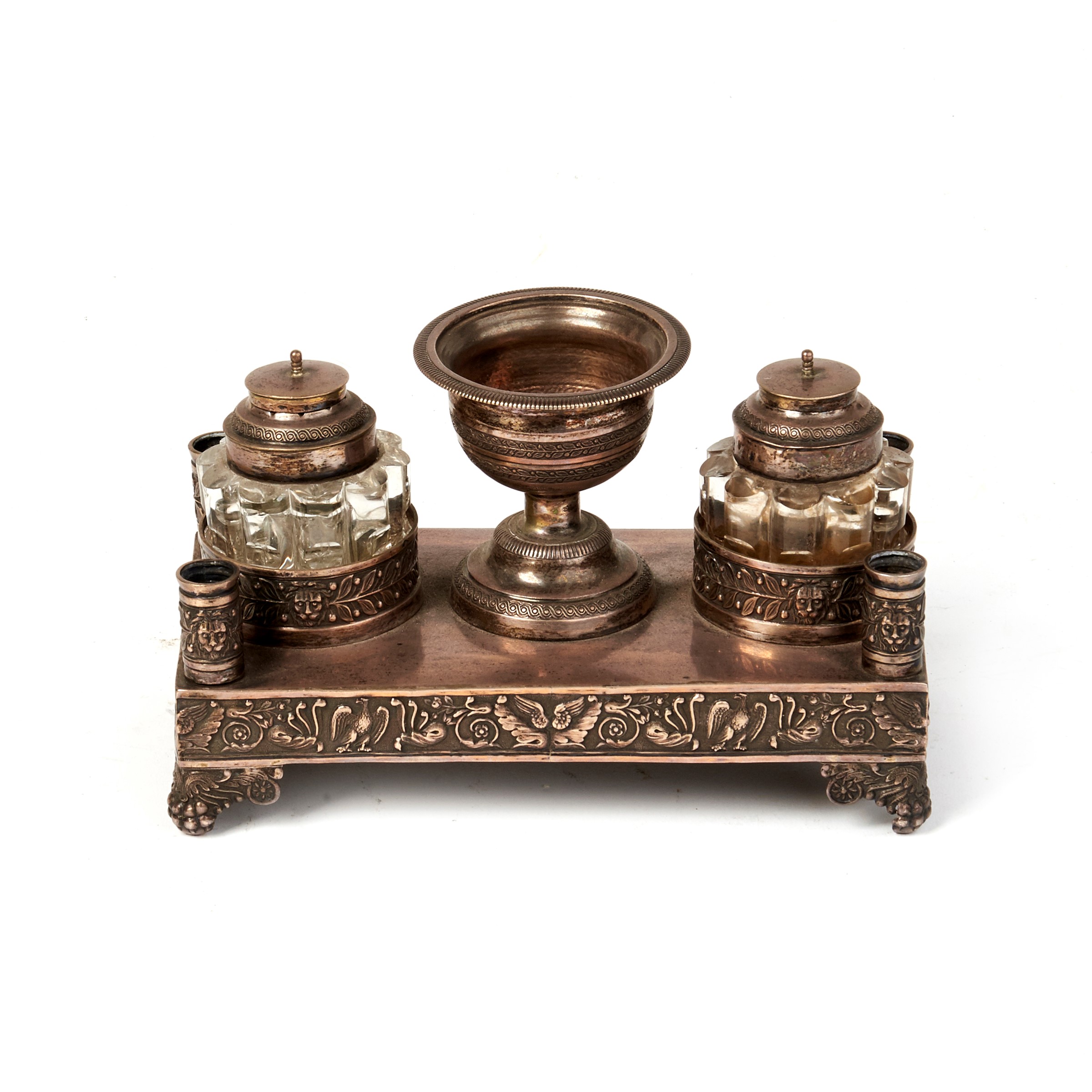 in argento sbalzato, di forma rettangolare, corredato di due porta inchiostro in cristallo, cm 17,5x9x11, g 270 netti
