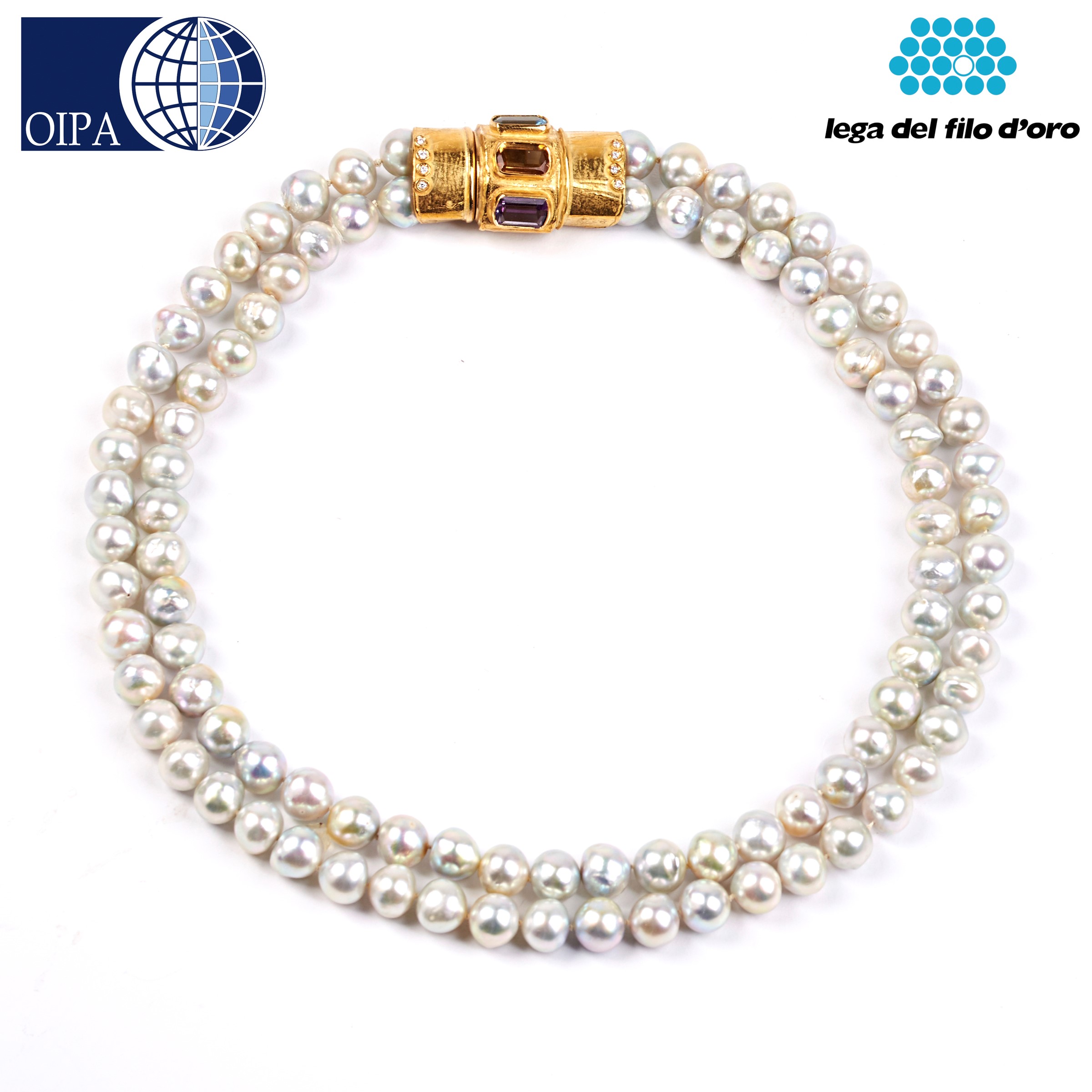 realizzata a due fili di perle grigie irregolari, mm 8/9, fermatura in oro giallo 18kt decorata con pietre di colore e piccoli diamanti, lungh. cm 45