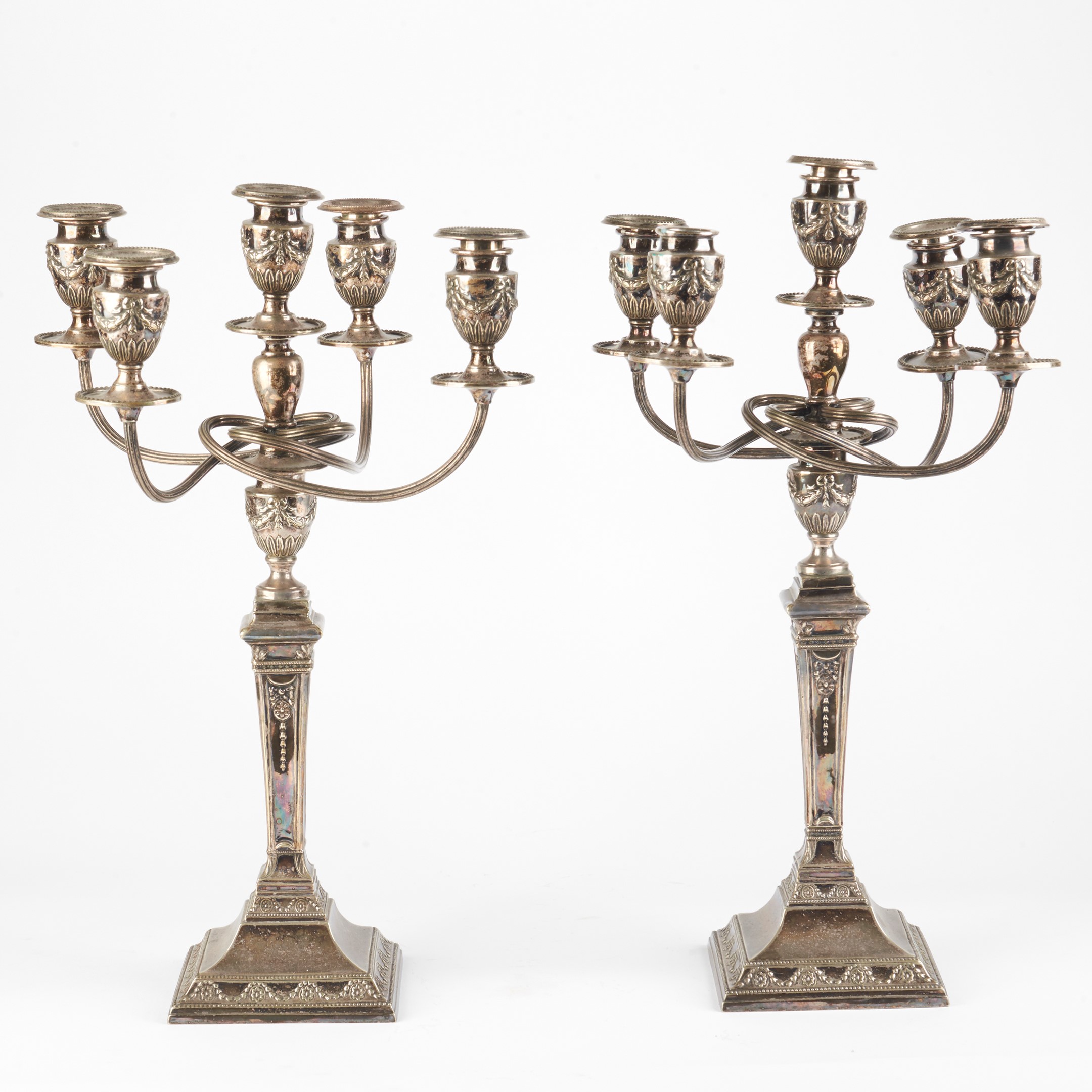in metallo argentato a quattro bracci ricurvi e scanalati, cinque portacandele fusto a colonna, base quadrata decorata, alt. cm 49, diam. cm 31