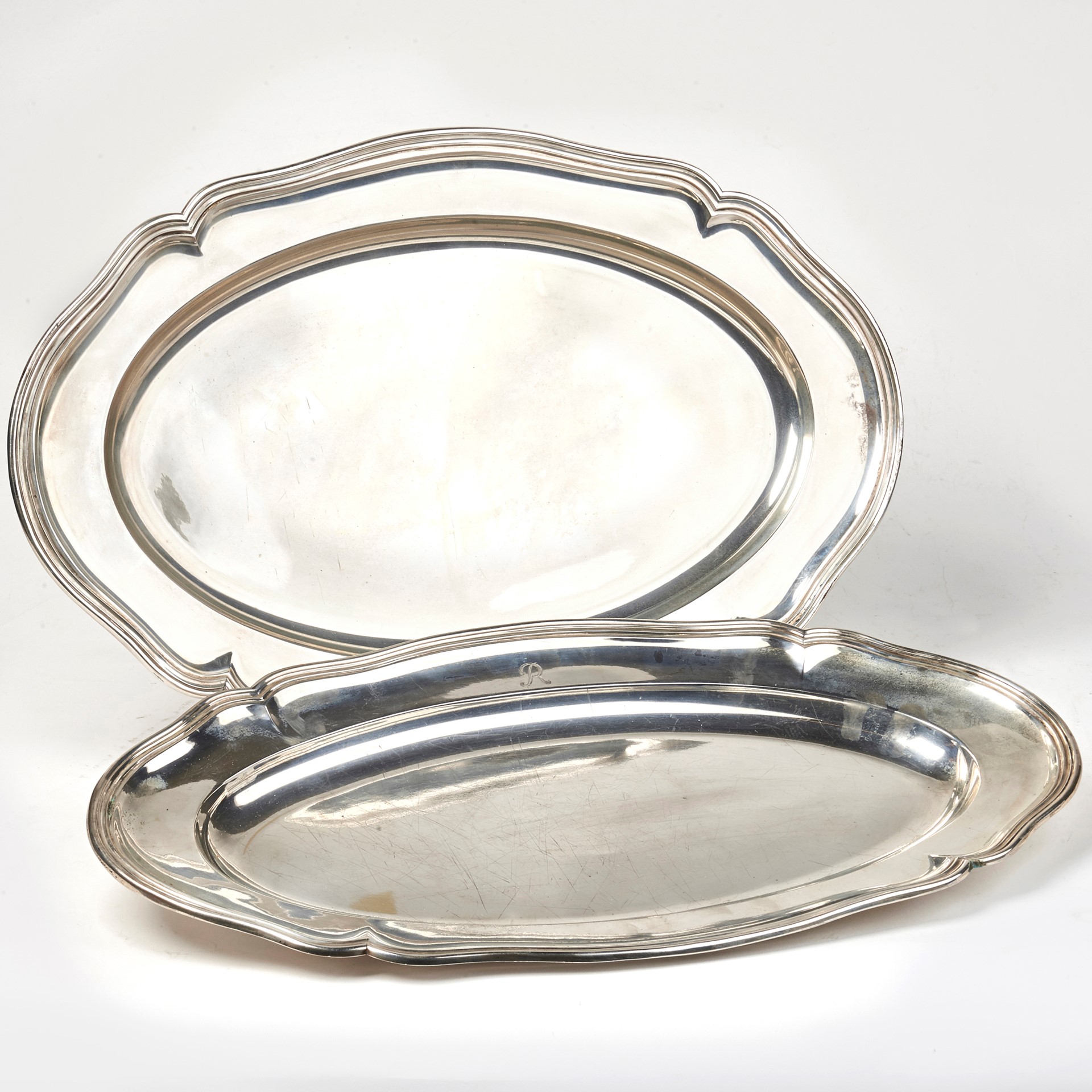 in argento, di forma ovale sagomata, bordo scanalato, cm 50x33 e cm 50x27