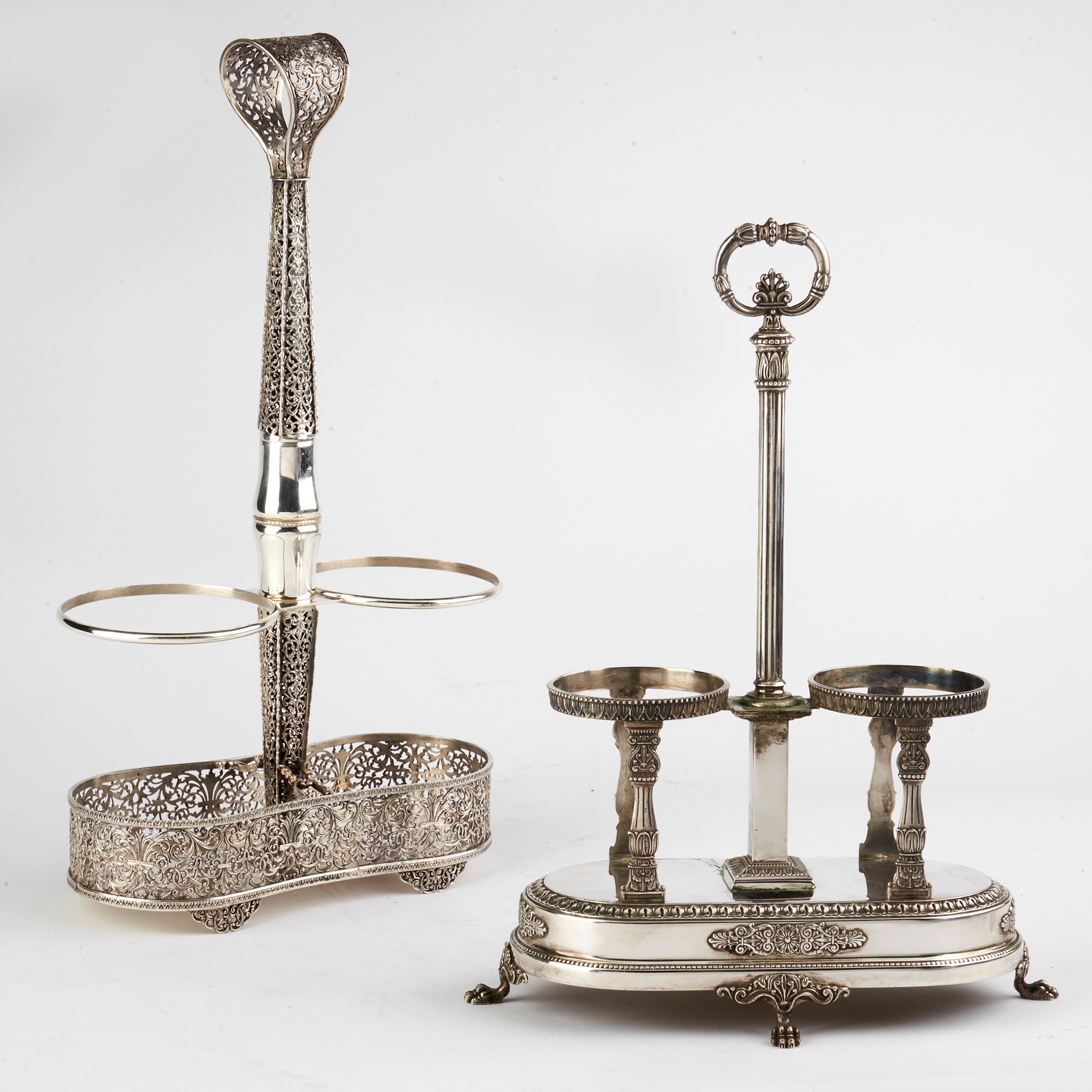 in argento traforato e cesellato, fusto a colonna, base ovale con ringhiera, alt. cm 39, lungh. cm 21, reca punzone MI515
